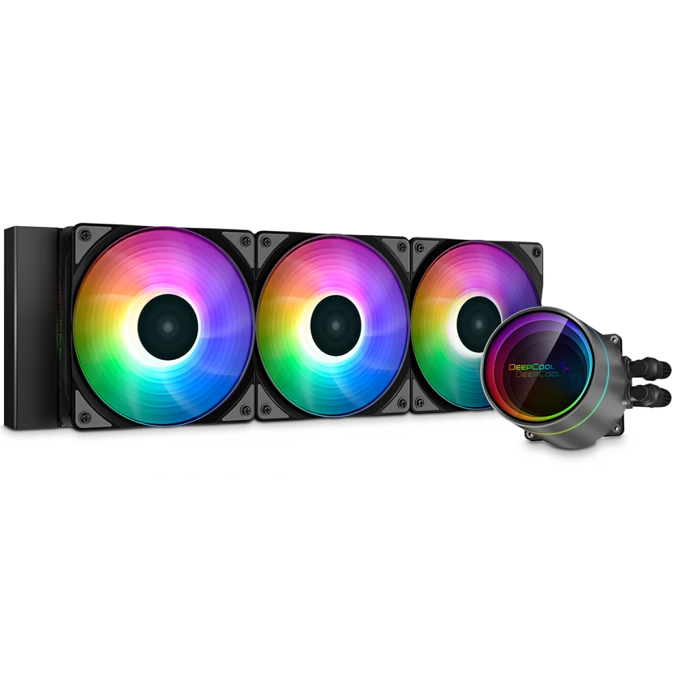 Compact, universal water cooling with 3 120 mm A-RGB fans with controllable lighting and water cooling block.