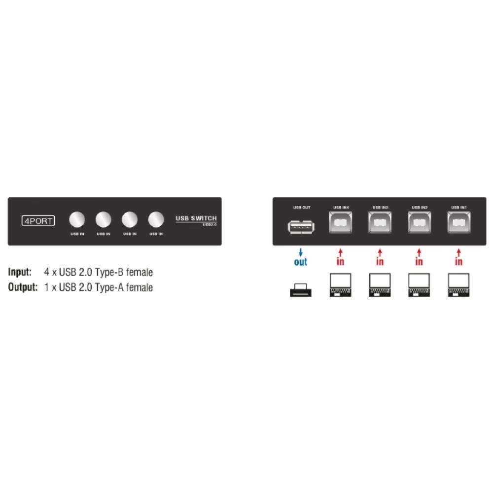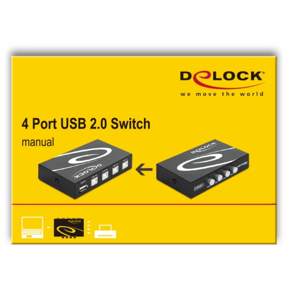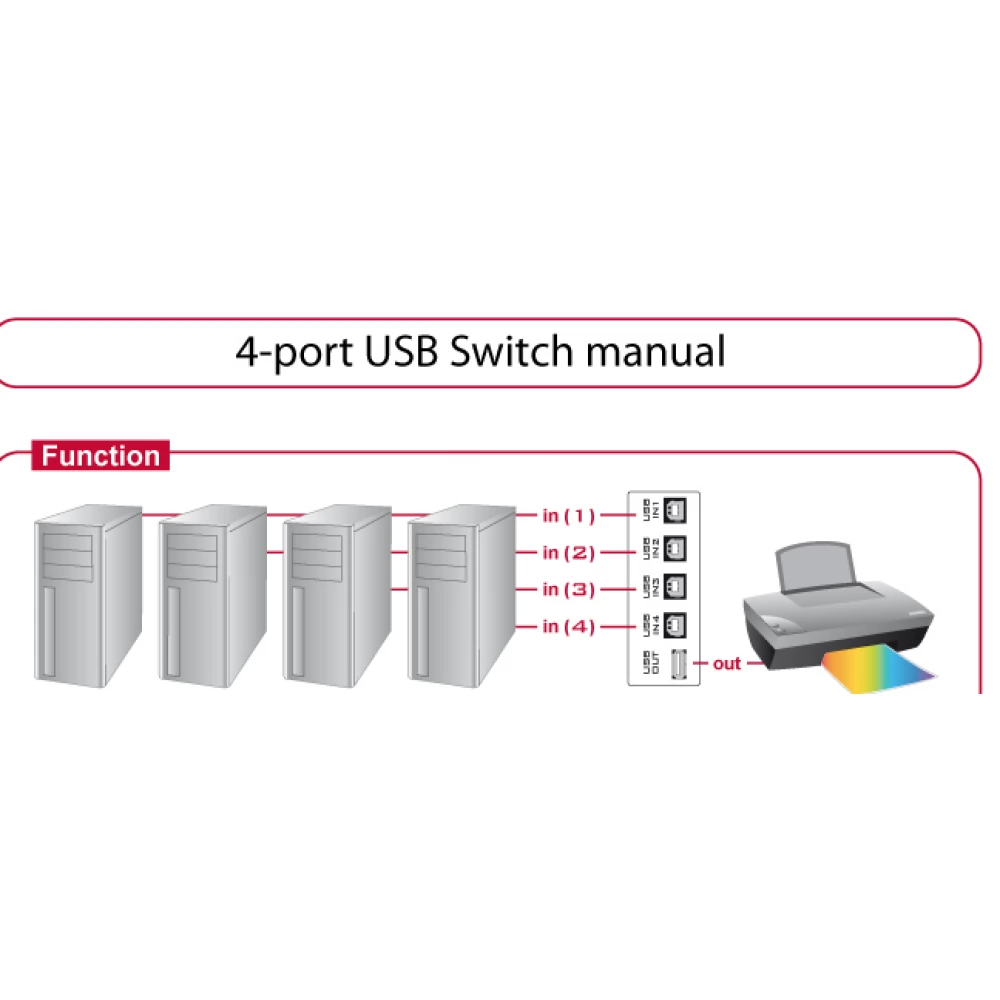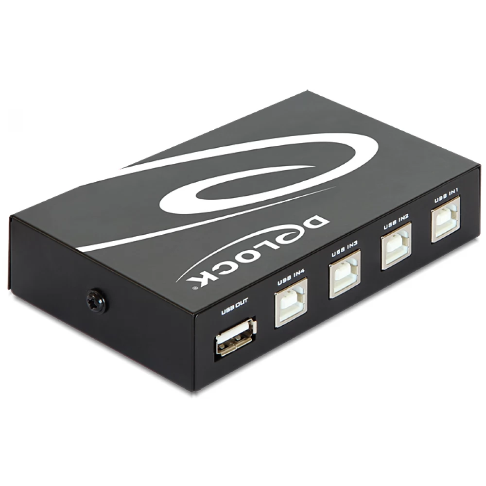 With this Delock switch, one USB device can be connected to four computers or laptops. This can be used to connect e.g. a hard disk (HDD), printer, scanner, etc. You can also manually select which one to connect to the USB device with one of the four buttons.