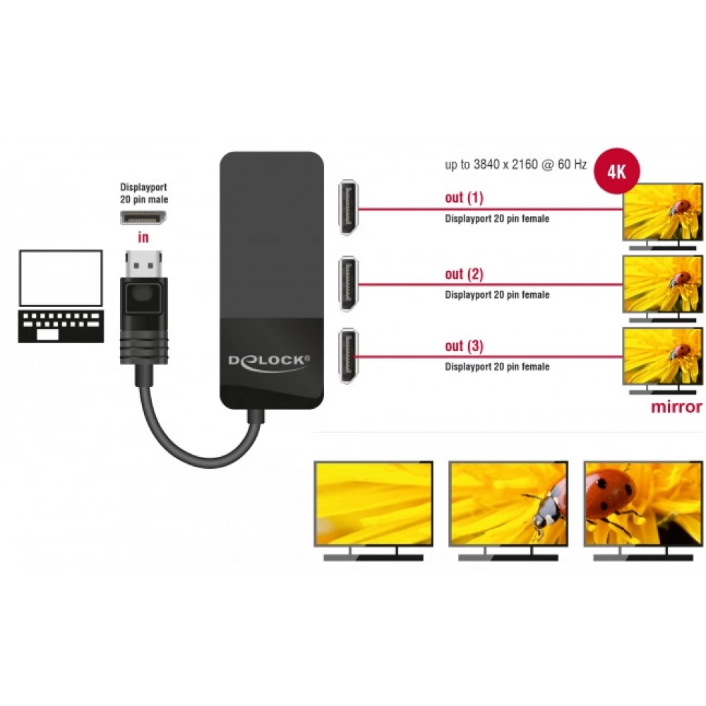 Delock's splitter receives a DisplayPort signal from a PC or laptop and distributes it to three connected displays. Thus, one DisplayPort connection can be used to operate three DisplayPort displays.