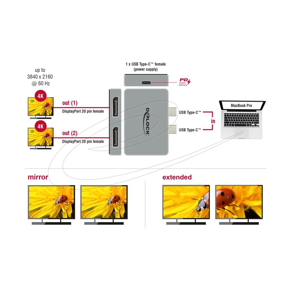 This Delock adapter can be connected to a MacBook via two adjacent Thunderbolt™ 3 ports, such as the MacBook Pro. Two screens can be operated on the DisplayPort outputs at the same time with 4K 60 Hz.