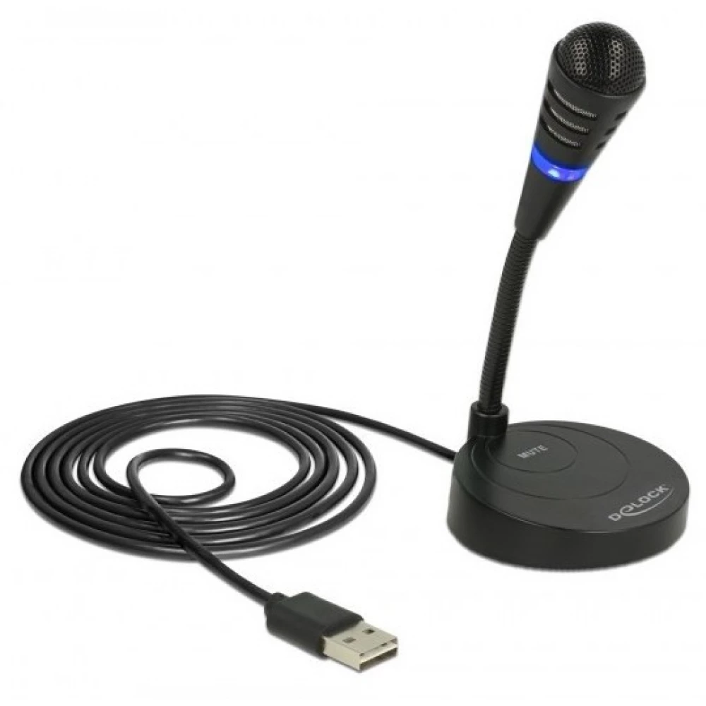 This Delock USB microphone can be used to send voice and melody. The rubberized base provides a non-slip base and the throat tube allows you to adjust the microphone in the ideal direction. The LED ring indicates with a blue or red light that the microphone is ready for operation, and the device can be silenced using the touch mute button.