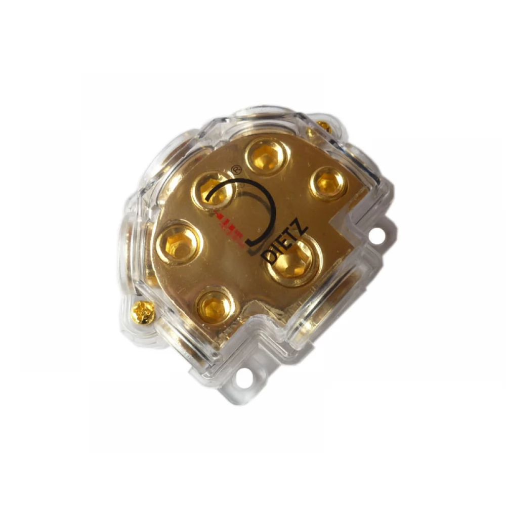 This gilded -coated body distributor provides maximum help when using multiple amplifiers for the ideal connection of body cables. There is no need to force any more on the screw selected for the body point, it is sufficient to drive up to 50 mm2 to the distribution and further with the appropriate diameter to the amplifiers. Thanks to the gilded coating, it provides perfect riples and minimal surface resistance without oxidation. Its design is both practical and demanding at the same time. Using the body distributor, you can save you excess cable length, wire harness weight and, last but not least, with multiple output diameters to drive the right cross -section cable for each amplifier, which is an important consideration under competition as it is evaluated separately.