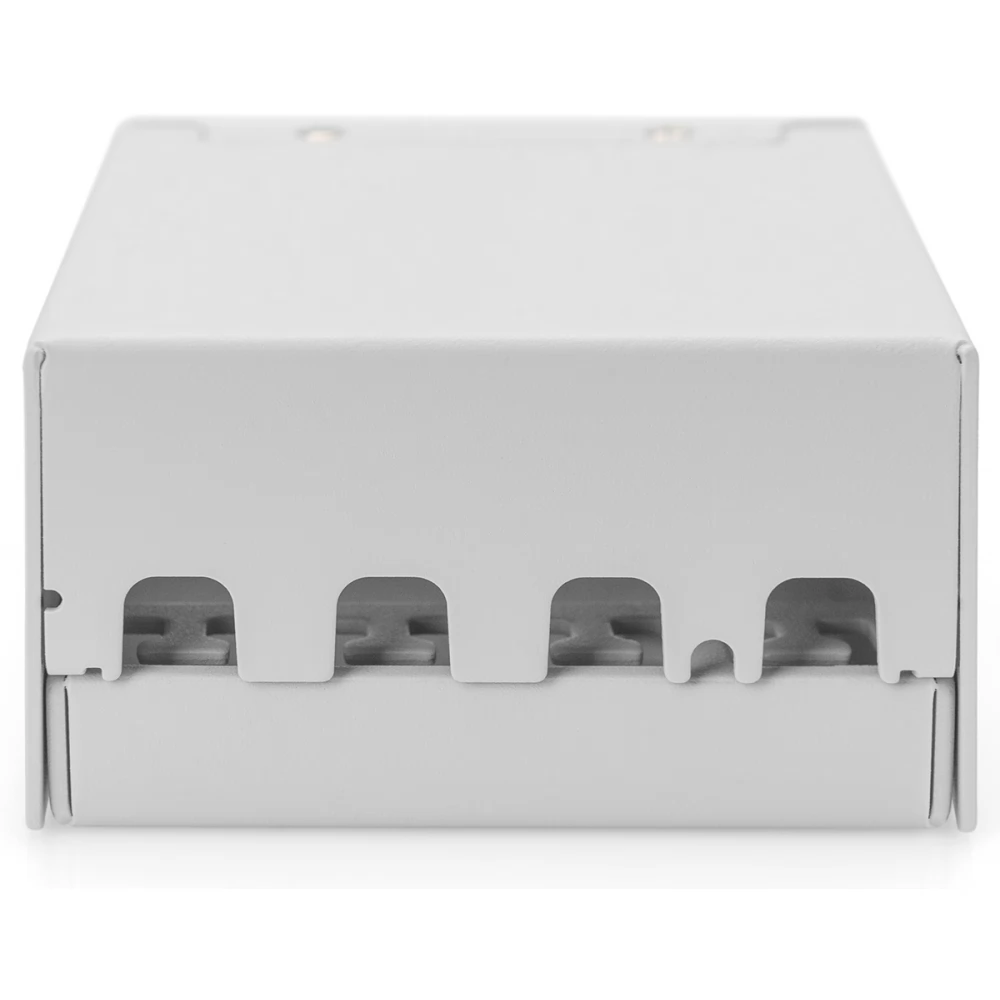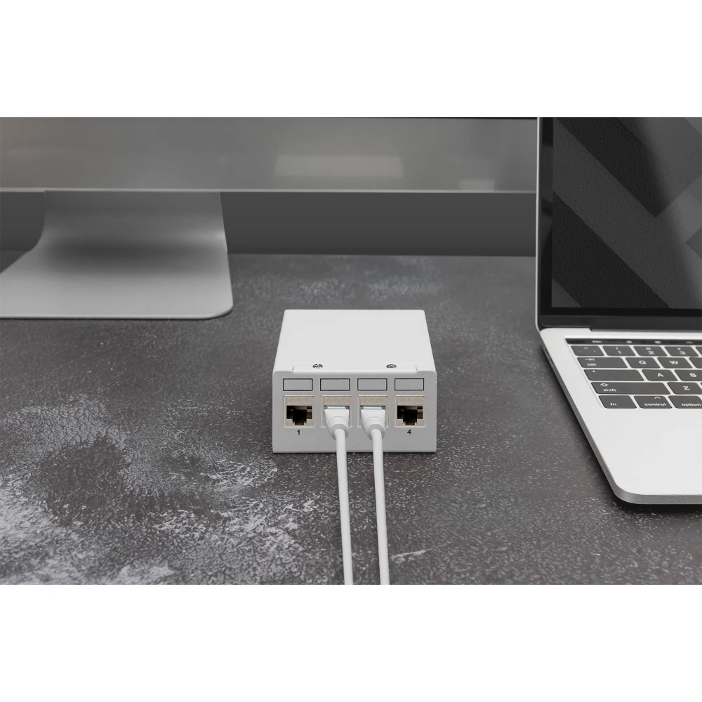DIGITUS® Desktop Patch Panels are an ideal solution for SoHo applications (Smart Office Home Office). The 4-port patch panel is a perfect solution for organizing and managing network cables in various environments such as industrial, data centers, offices, buildings and homes. With full shielding, the patch panel is protected against interference and provides stable transmission. The integrated design without edges gives it an elegant appearance, and can be flexibly installed as a table or wall holder. The patch panel is easy to install and takes up little space in your office or home. It fits into a 10-inch cabinet or rack and has built-in cable management and a removable top cover to secure cabling. The fixed back design adds organization and elegance. The patch panel made of cold-rolled steel is durable and highly compatible with all types of modules. It is certified to provide a reliable and secure way to organize and manage network cables. The patch panel is available in light gray and offers 4 ports for various applications. This patch panel is a high-quality and reliable solution for organizing and managing network cables in various environments.