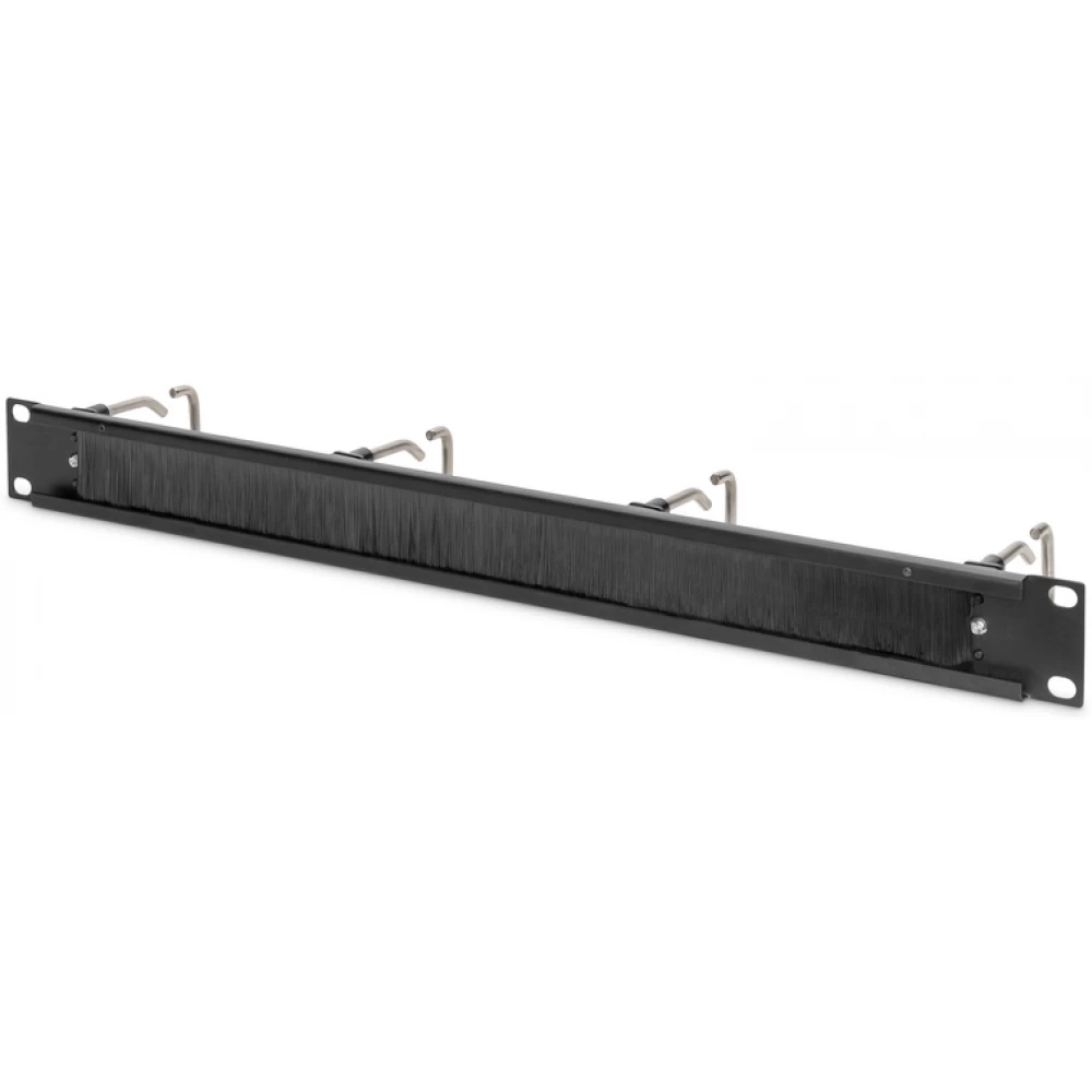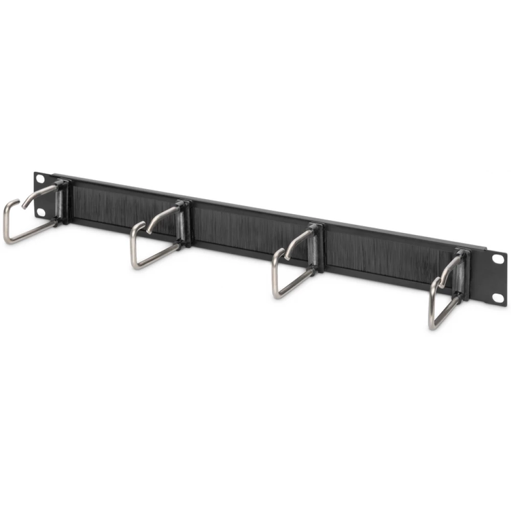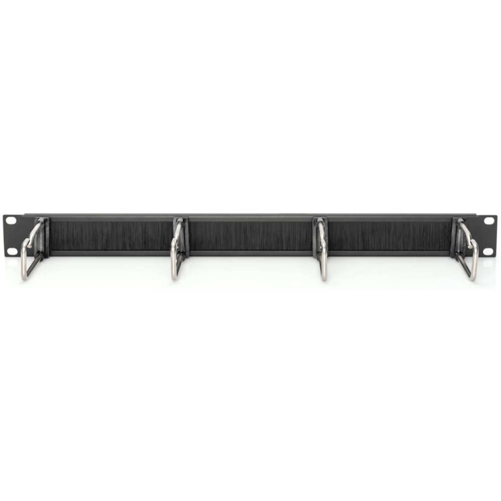 1U cable management panel with brush 4x steel ring 40x75 mm, black (RAL 9005).