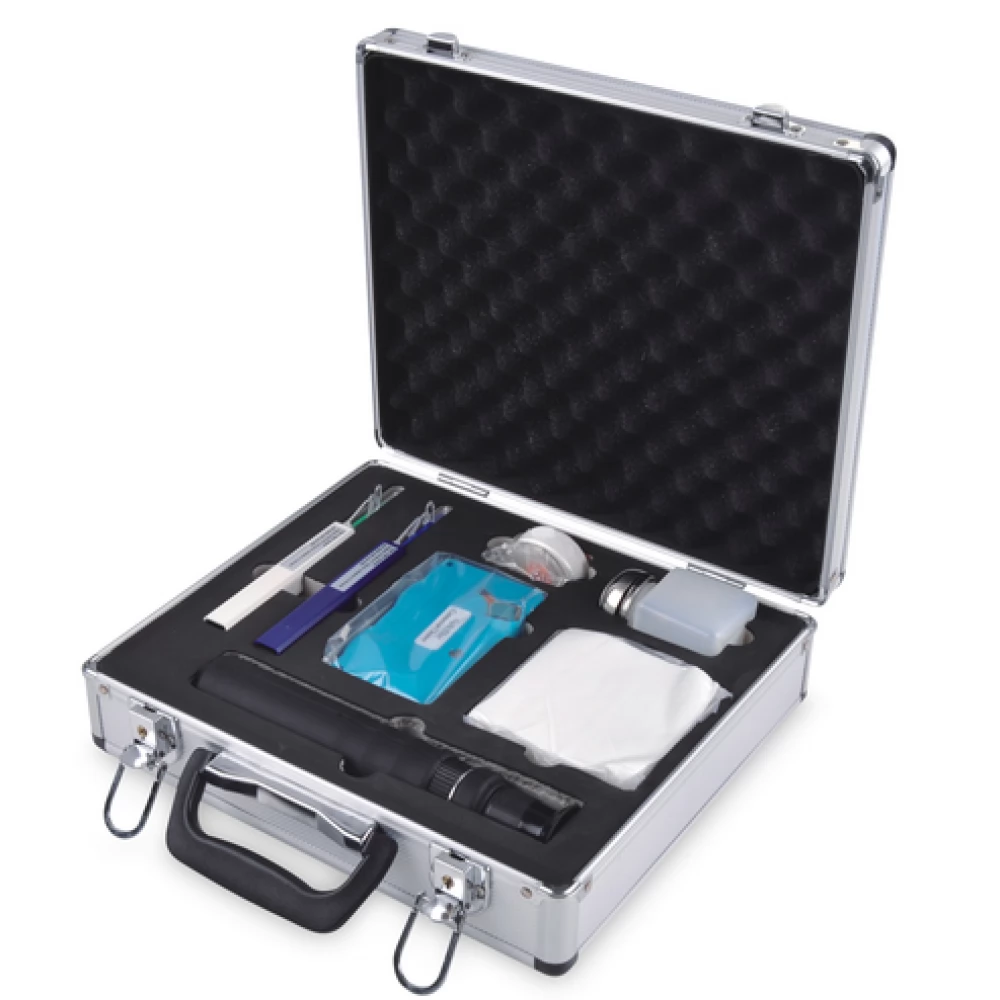 FO inspection and cleaning set incl. microscope, cleaners, wipes, pump bottle.