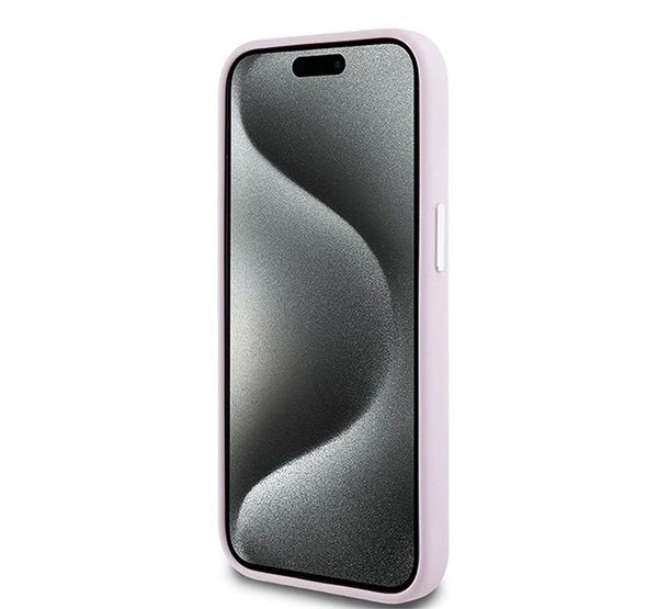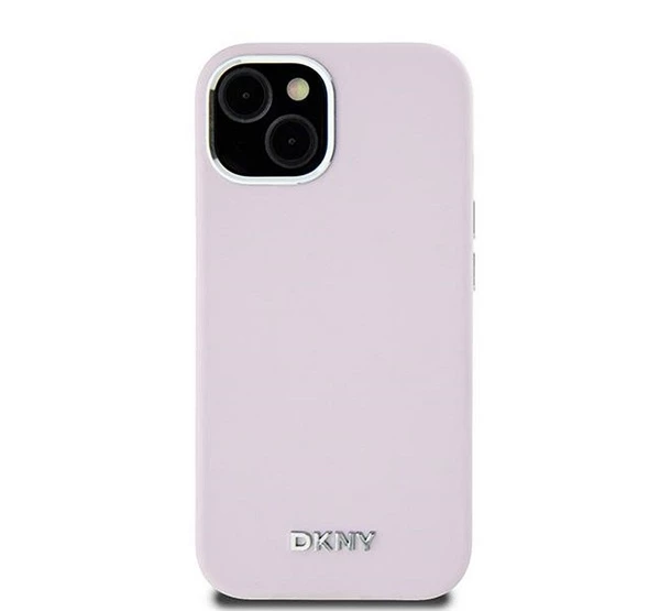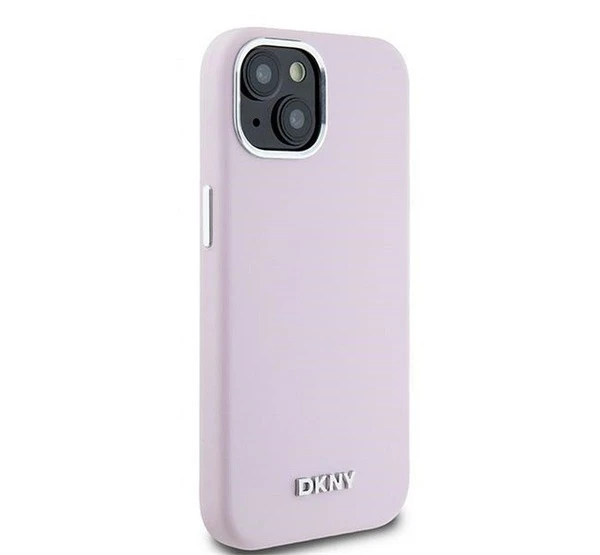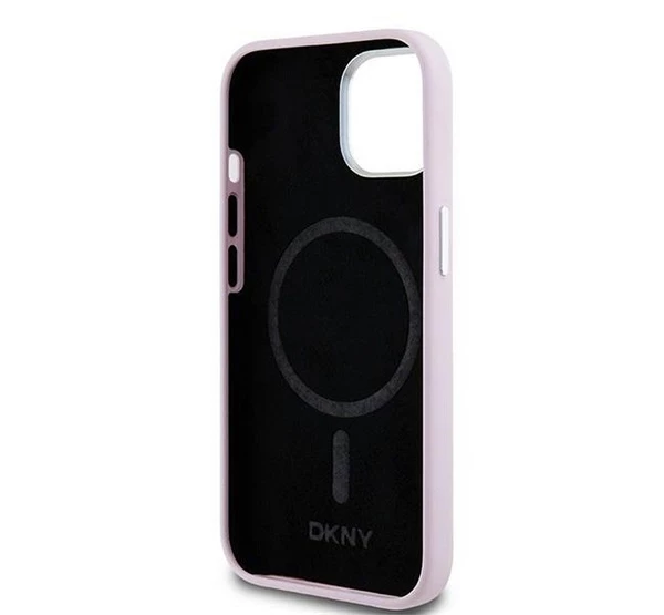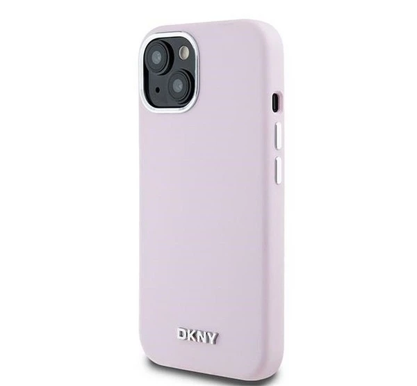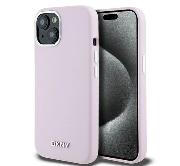 DKNY Liquid Silicone Silver Metal Logo Magsafe iPhone 15 back panel case pink