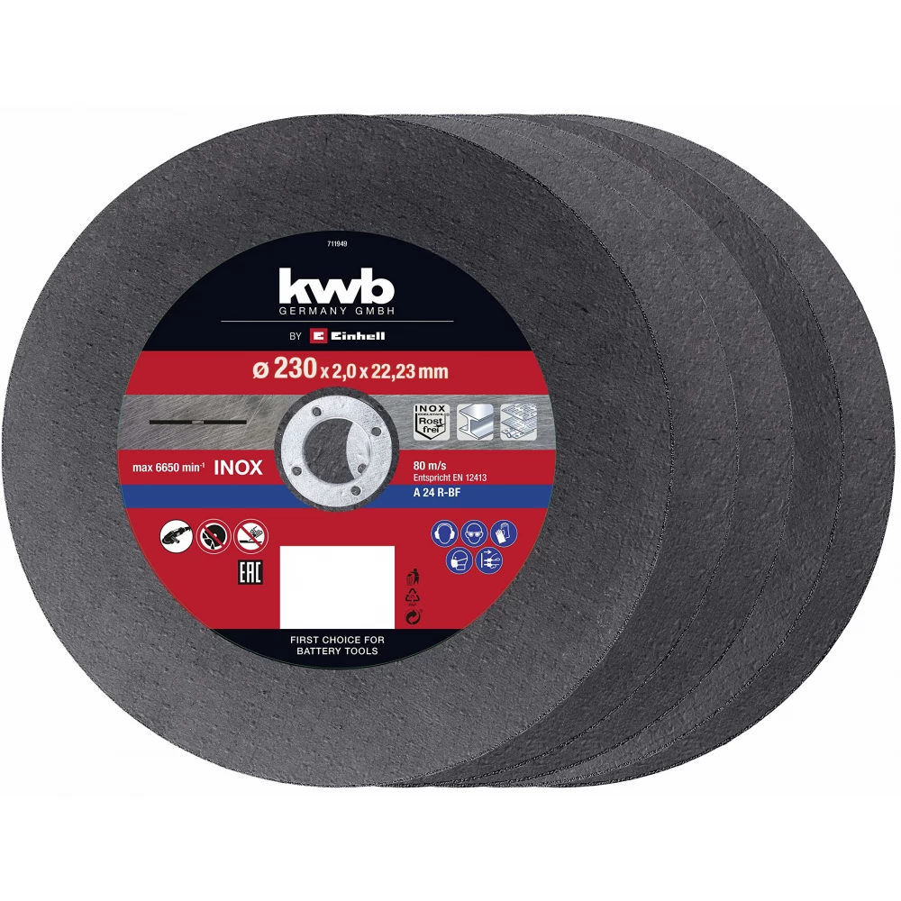 High quality cutting disc set. Suitable for angle grinders, cordless angle grinders or flexes from various manufacturers with 230 x 2.0 and 22.23 mm diameter holes. Ideal for cutting sheet metal, pipes, metal and stainless steel.