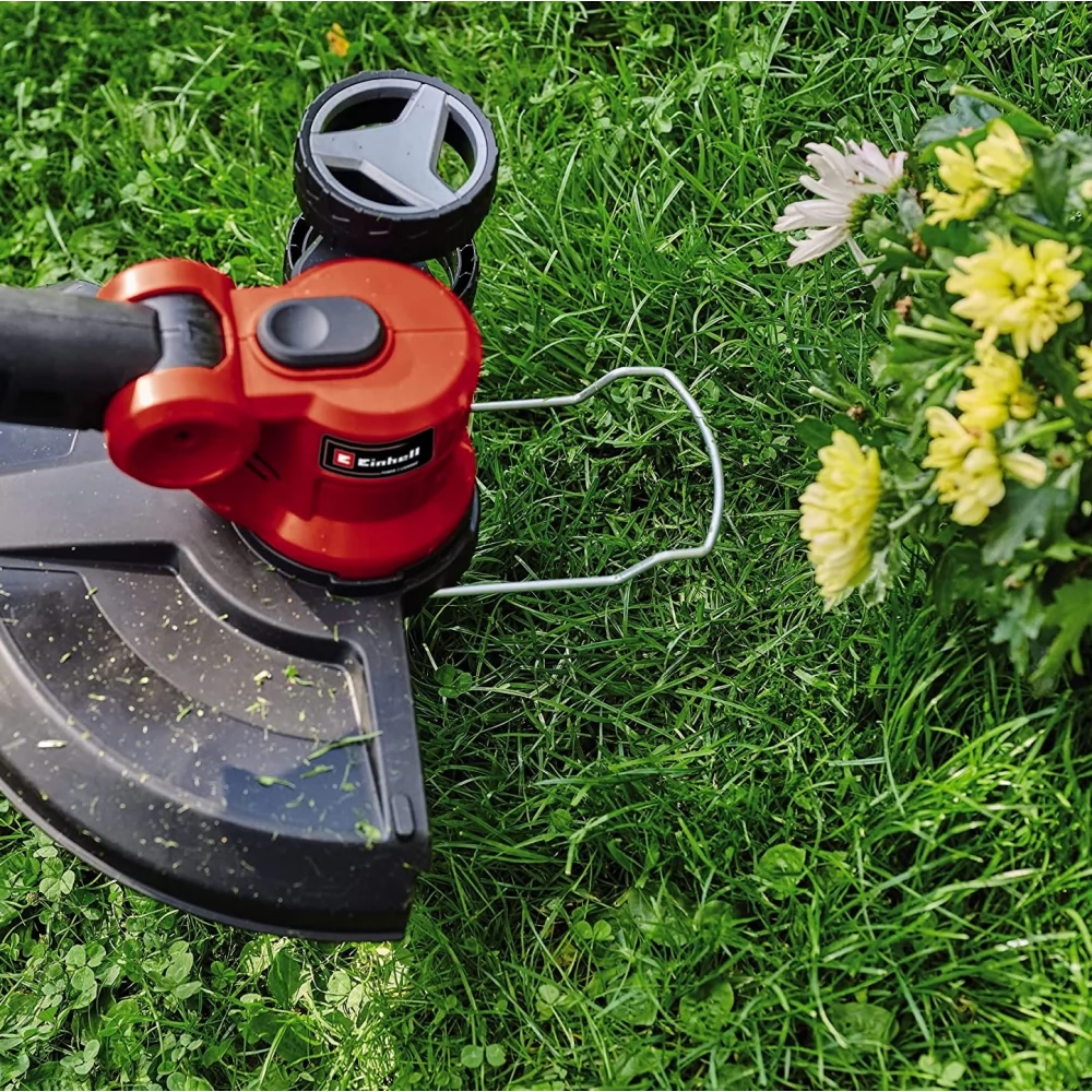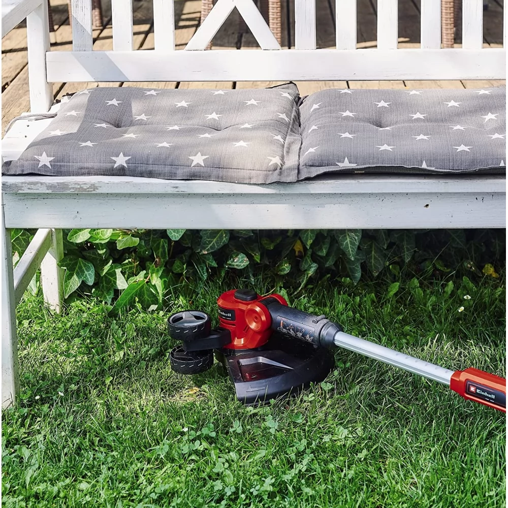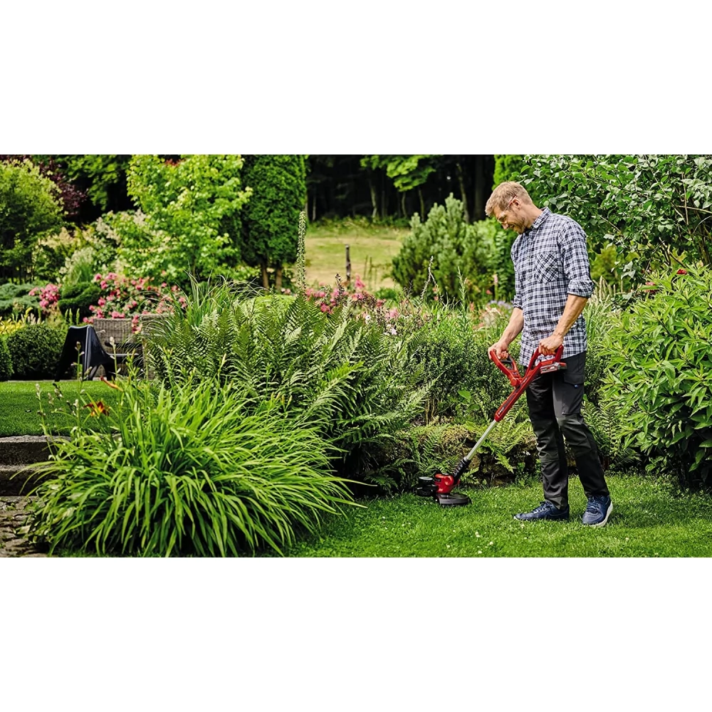 If you choose the Einhell GE-CT 18/30 Li-Solo battery lawnmower, the end result will always be perfect. It doesn't matter if you work along edges, corners or edges: no one and nothing can stand in the way of your newest battery-powered garden helper! Maximum comfort is ensured by the handle that can be easily, quickly and easily pulled out, the adjustable spare handle and the Softgrip covered surfaces. The motor head can be rotated 90°, making it perfect for beautifying vertical surfaces and borders. The included guide wheel enables precise cutting, even if you use the device for edge cutting. The motor head can be tilted to three different angles, thus ensuring flexible use in a wide variety of places, e.g. under bushes or other similar hard-to-reach places. Flowerguard protects flowers, plants and trees. The device is supplied with a damil head, on which 5 meters of damil is wound at the factory. The practical tip automation ensures that the damil is reduced. You can operate the hedge trimmer with 18 V batteries from the Power X-Change series. You can use the battery for all other devices in the system family. The device is available without battery and charger. You can buy these separately, for example in the form of practical starter packs.