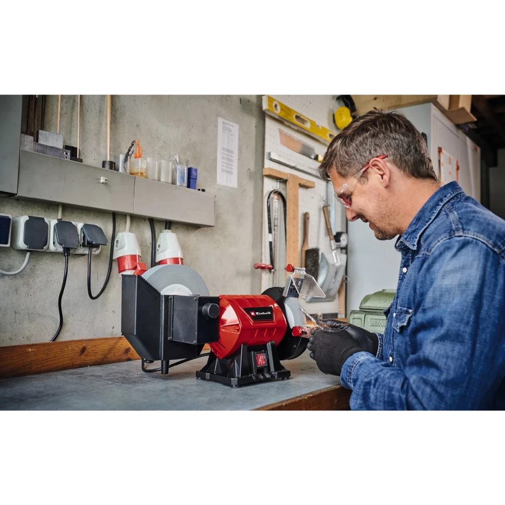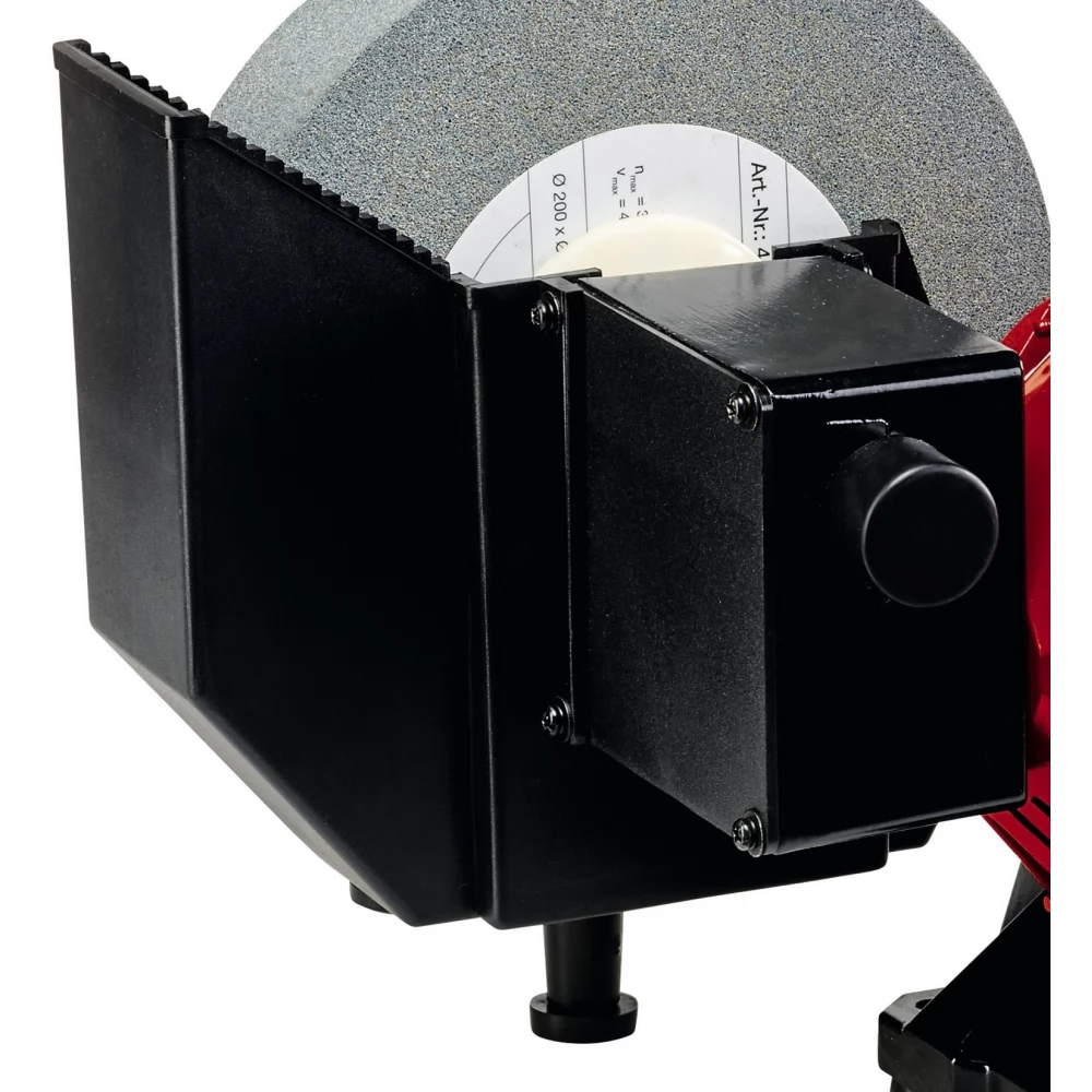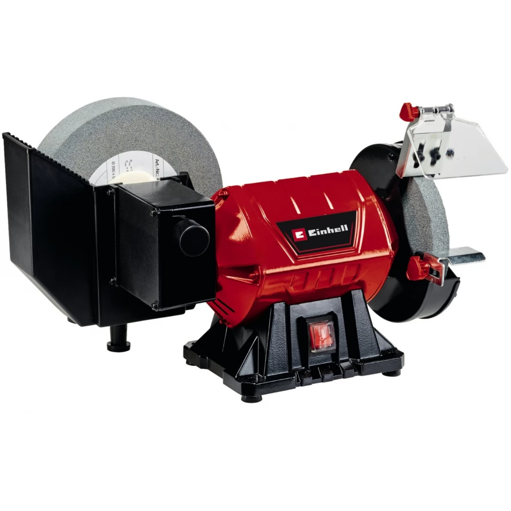The Einhell TC-WD 200/150 wet/dry grinder is an extremely practical machine tool that makes the work of handymen easier, no matter what grinding project they tackle. With the help of the grinder, you can sharpen any blade, drill bit, scissors or knife. The durable and compact metal construction ensures a long service life. The device is equipped with a large stainless steel water tank. The large and adjustable work plate allows you to perform a wide variety of tasks with ease, and the backlash-free ball-bearing shaft always guarantees accurate results. Safety is ensured by spark arrestor glasses, which can be adjusted without tools, and side-closed protective covers. The reduced vibration level and maximum stability are ensured by four rubber feet. The factory packaging of the device contains 1 coarse disc and 1 slow-rotating, fine wet grinding disc.