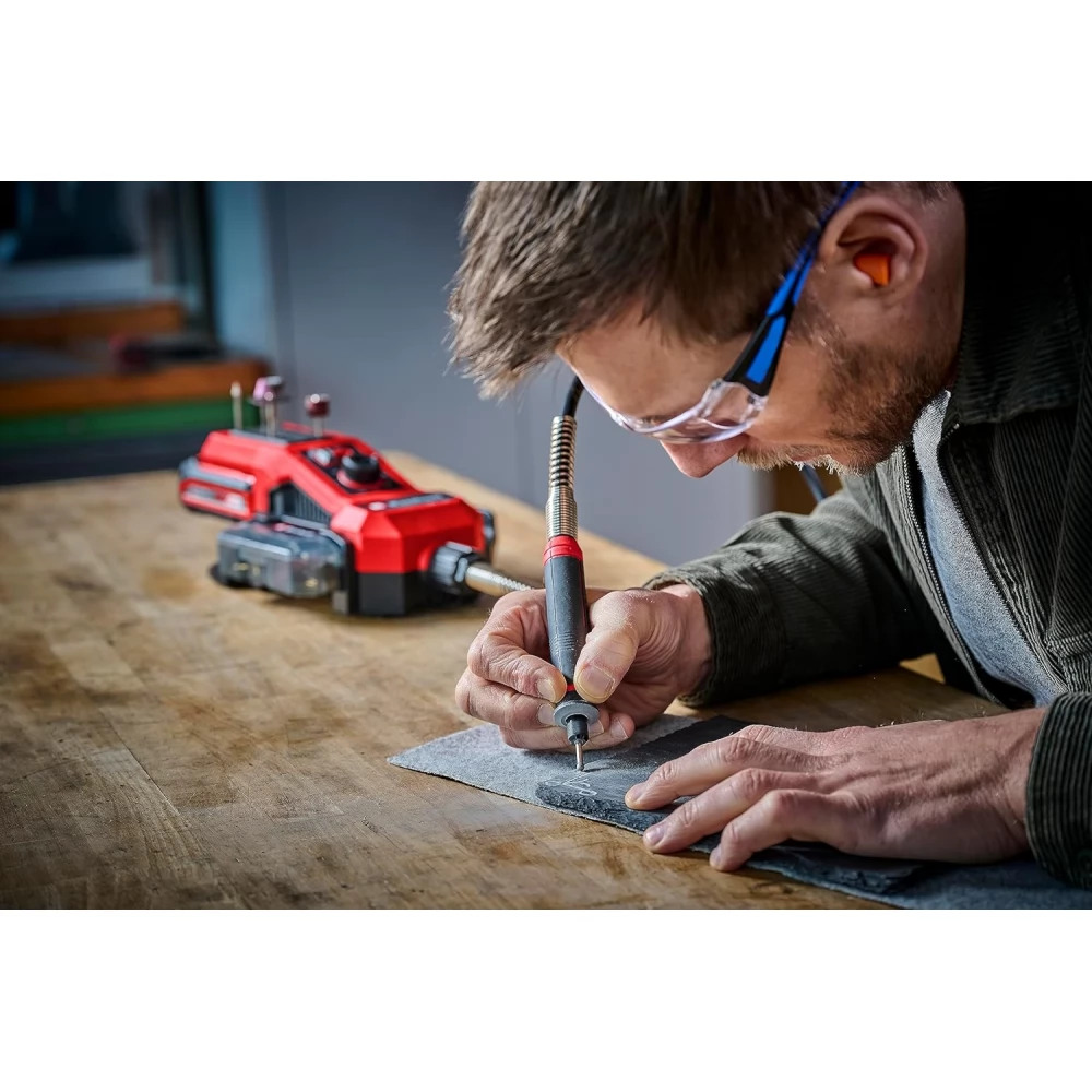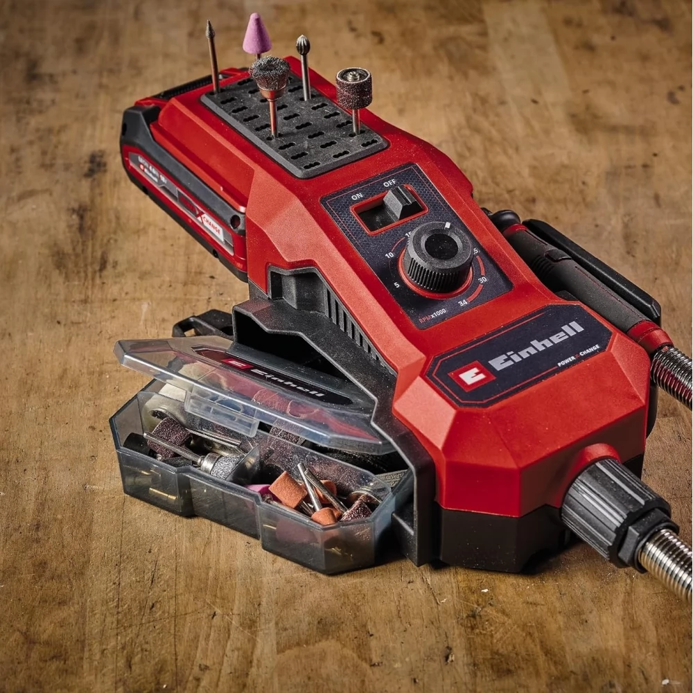 The Einhell TE-MT 18/34 Li-Solo cordless sanding and engraving device is an indispensable helper during engraving, polishing, milling, grinding, cutting and cleaning work with a brush. The high-performance battery-powered device is a member of the Power X-Change product family, all elements of which - including all batteries, devices and chargers - can be combined with each other. The continuously adjustable speed control electronics ensure that the performance of the device can always be adjusted to the properties of the material to be processed (5,000 - 34,000 rpm). The locking button enables simple and quick tool change. The pin on a 92 cm long flexible shaft provides optimal results even when creating detailed patterns. Thanks to the slim design and the Softgrip surfaces, handling the device is extremely easy and comfortable. You can place the shaft and pin in the handy holder on the dock. You can store the most frequently used accessories in the holder on the top of the device. Thanks to the 150 cm long strap, you can even hang the device on your shoulder. The wall bracket enables space-saving storage. Rubber feet ensure maximum stability. The factory packaging also includes a 55-piece accessory kit. Without battery and charger. You can buy these separately, for example in the form of practical starter packs.