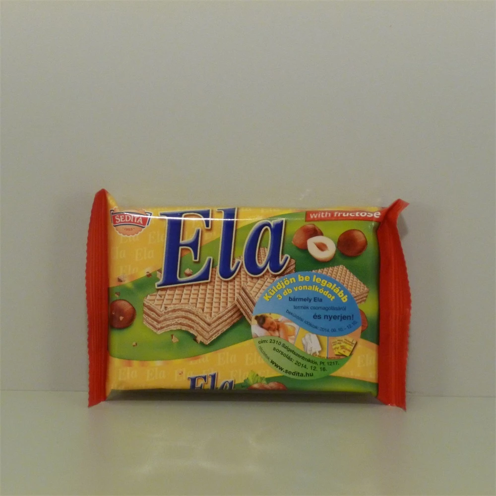 Wafer filled with hazelnut cream (79%) with fructose, Ingredients: Vegetable fats: (palm oil, coconut oil), wheat flour, fructose 19%, soy flour, inulin, skimmed milk powder, skimmed cocoa powder, roasted peanuts 1.2%, sunflower cooking oil, corn starch, emulsifier : (lecithins), flavors, egg yolk powder, Bulking agent: (sodium carbonates), salt. The product may contain peanuts. The product can also be consumed by diabetics within the permitted daily carbohydrate intake. Diabetics can consume a total of 30g of sorbitol and fructose per day within the permitted daily amount of carbohydrates. Nutritional value in 100g product: Energy/Energy/Energia 2345 kJ / 563 kcal