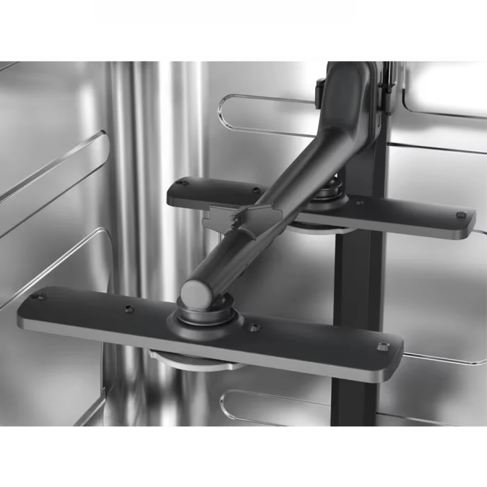 Unlike conventional sprinklers, the double -rotated satellite water arm sprays the water from 5 directions to the vessels. Therefore, all dishes will be clean in both upper and lower baskets.