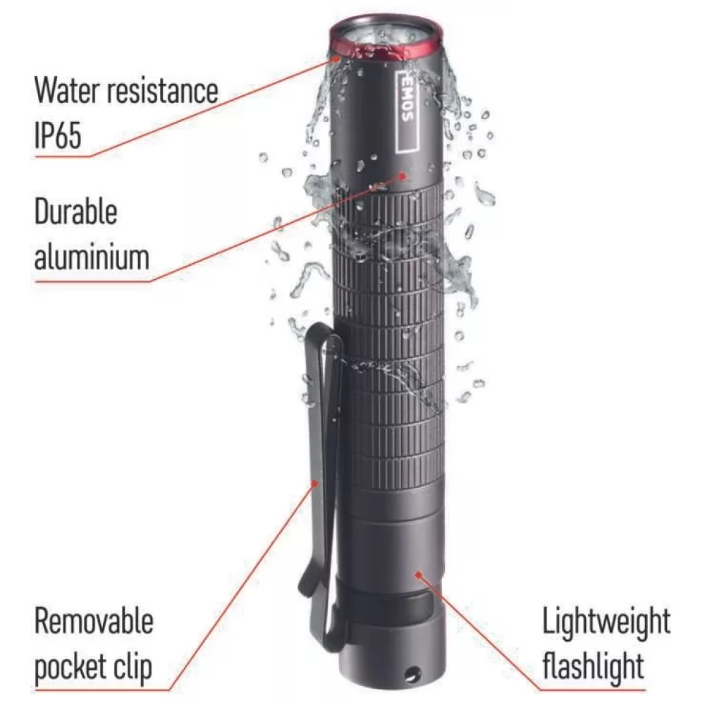 The EMOS Ultibright 50 flashlight is always at hand. Thanks to the fact that it is only slightly thicker than a AAA battery and less than 10 cm long, it is extremely compact and lightweight. It fits in every pocket, bag or purse.