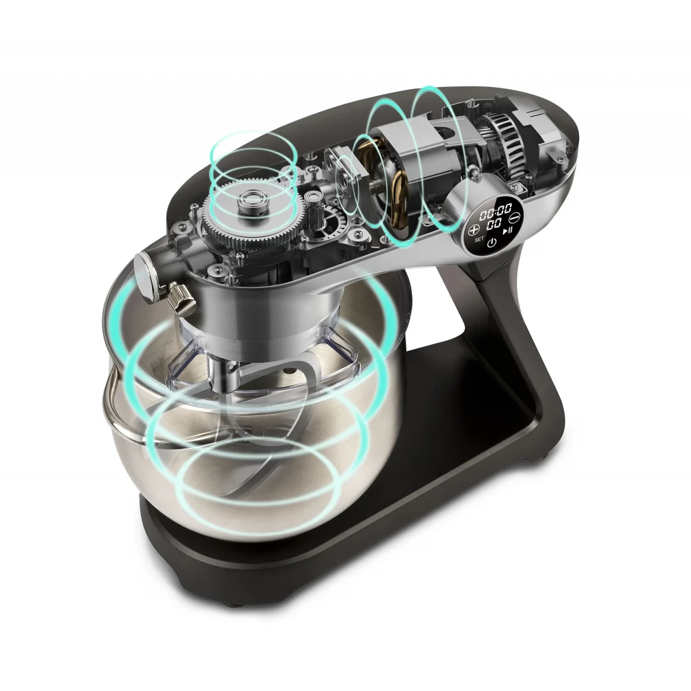 - Accessories: aluminum dough hook and mixer, stainless steel whisk (or planet mixer), transparent plastic cover