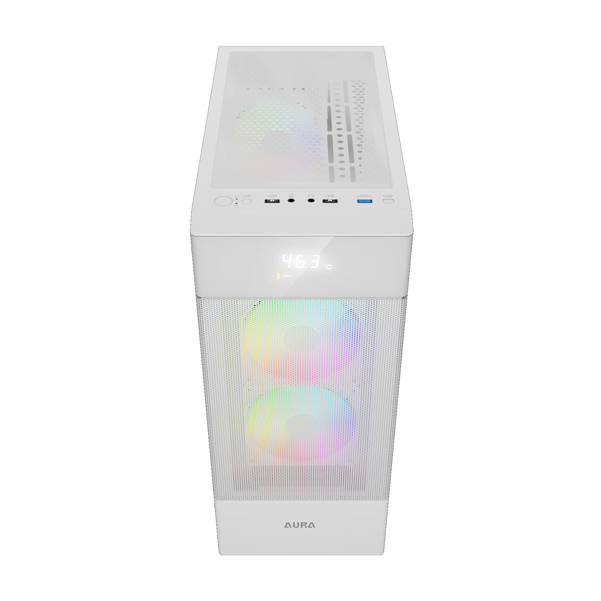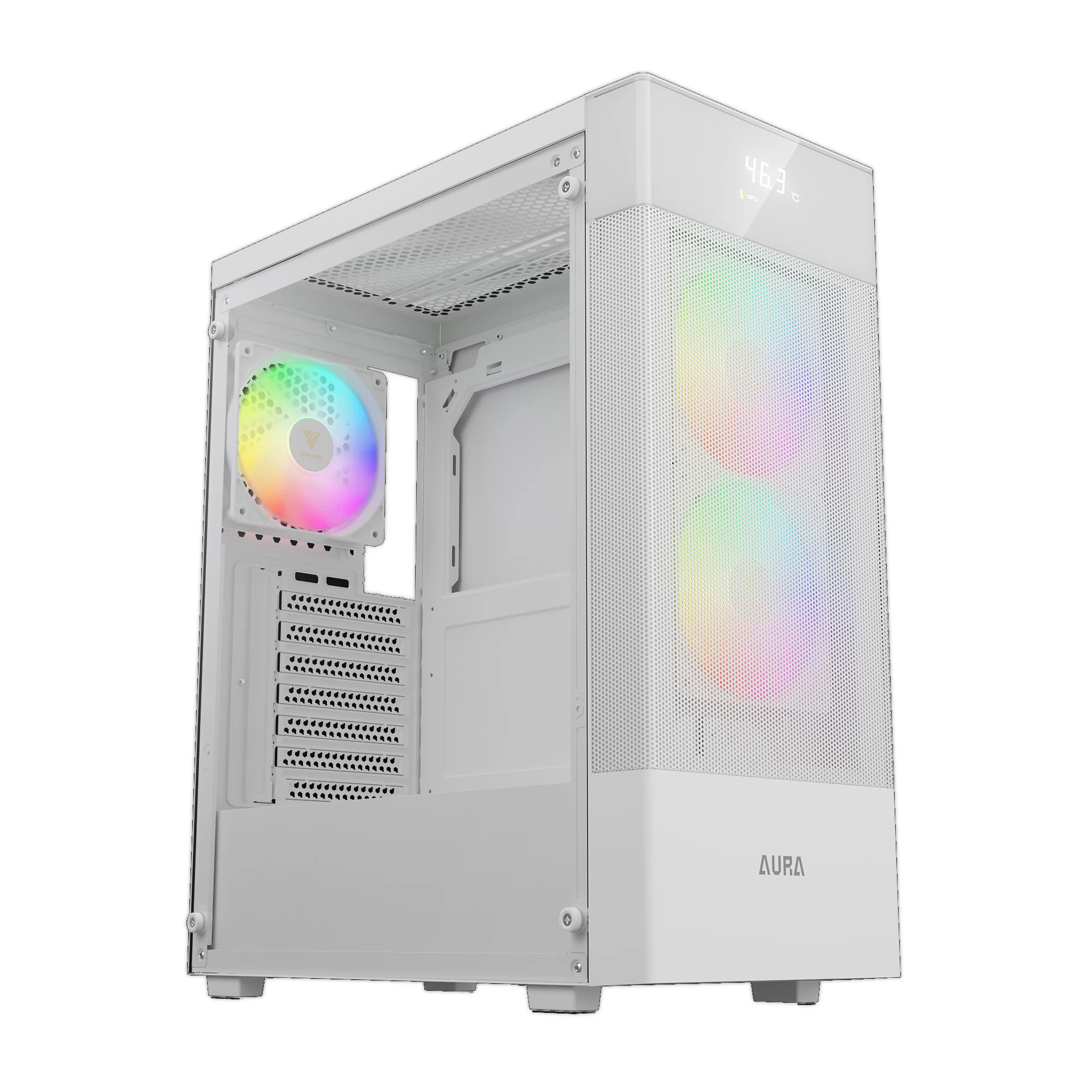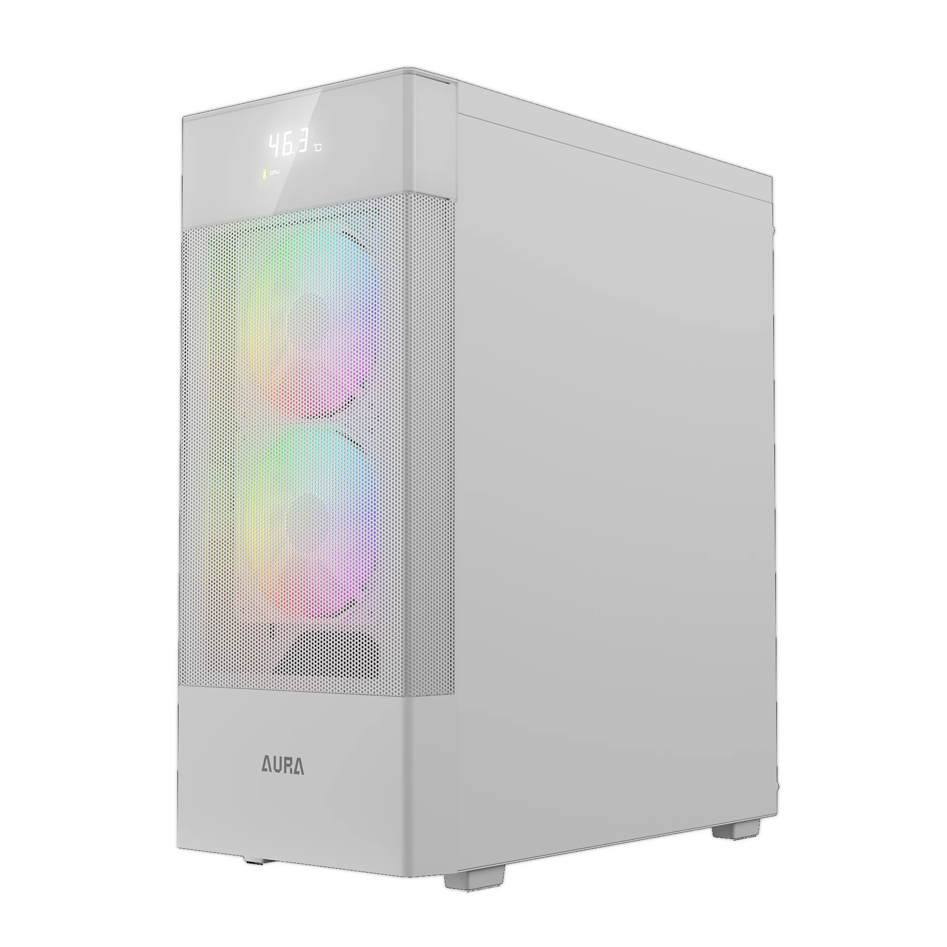 ATX format midi-tower design with front-facing digital display and 2 built-in 120mm ARGB fans.