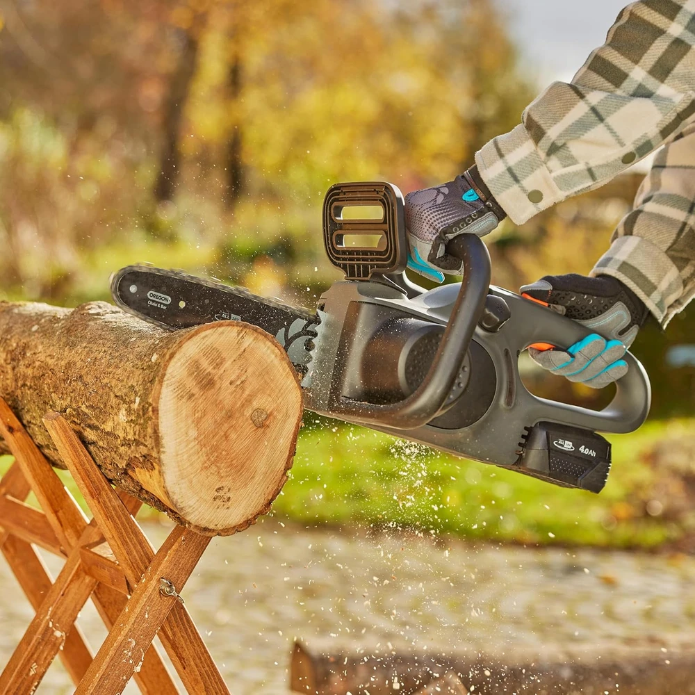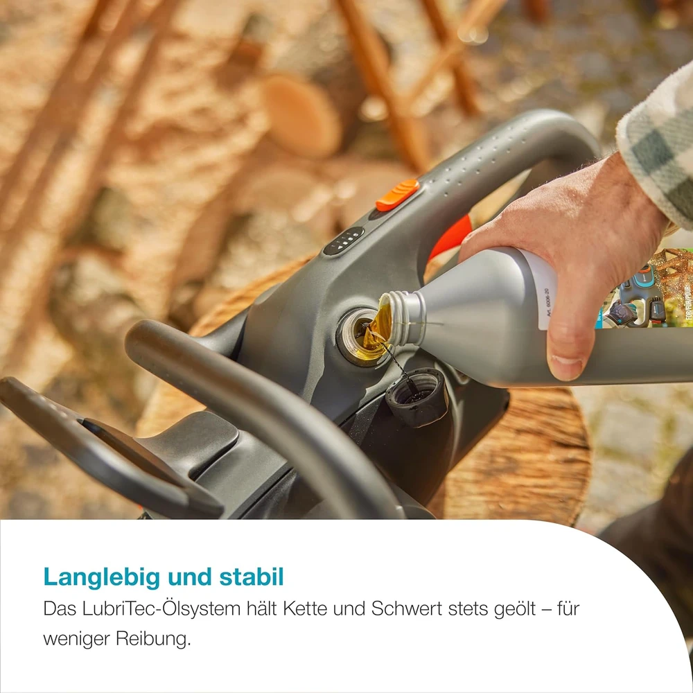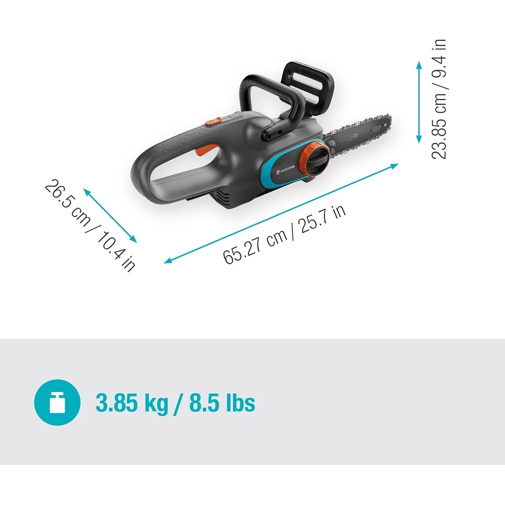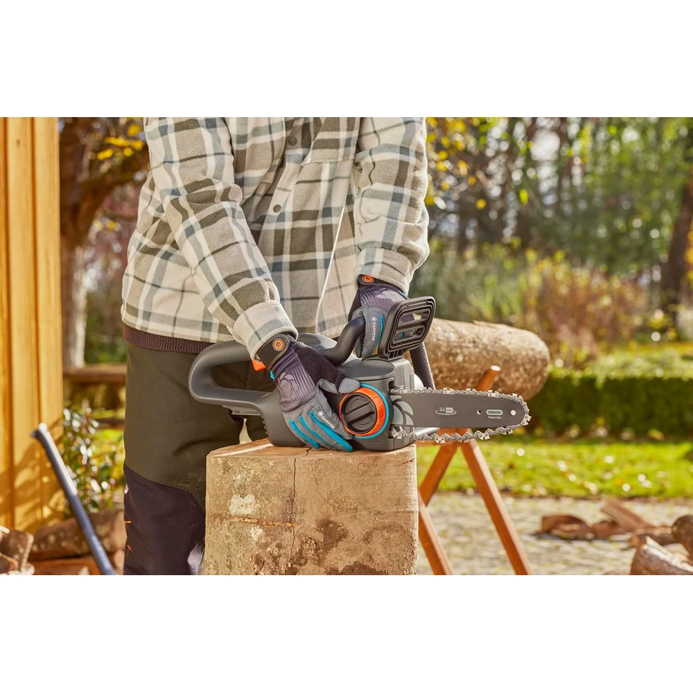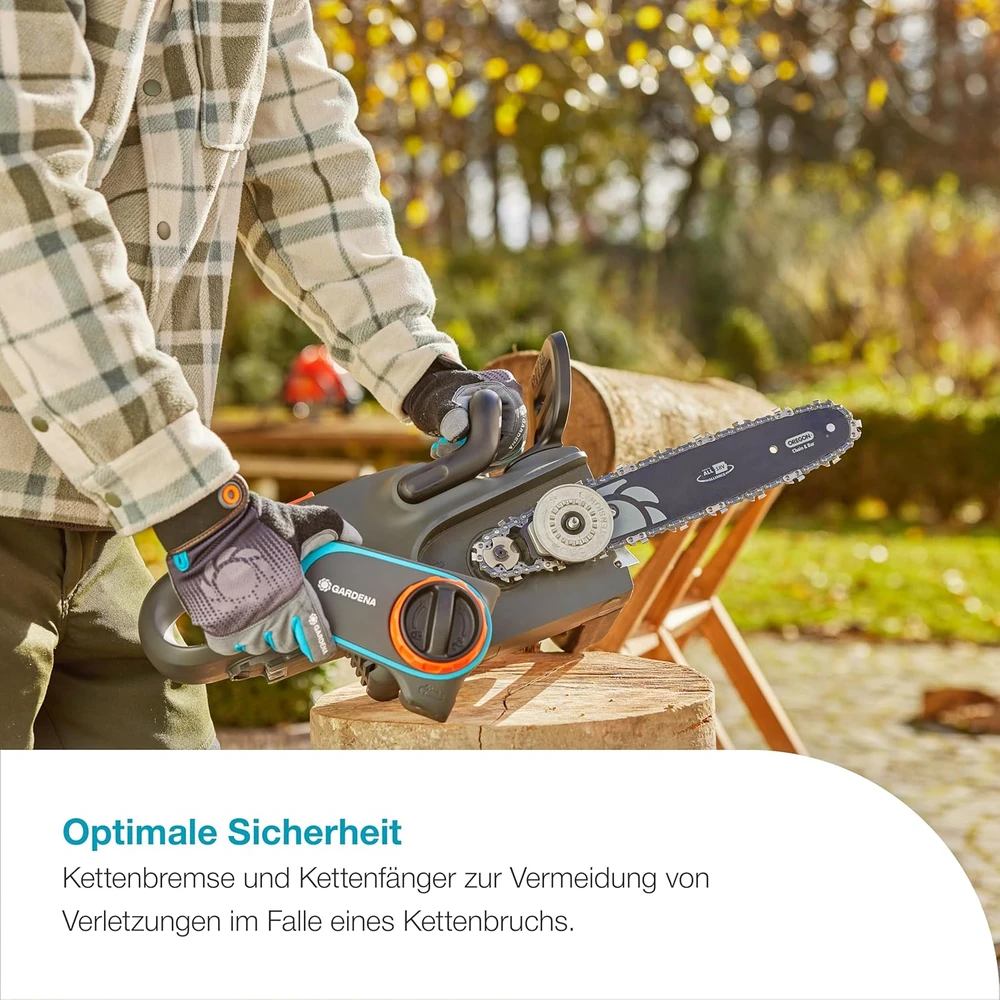 The compact GARDENA PowerSaw 250/18V P4A cordless chainsaw is ideal for more extensive woodworking tasks, it quickly prunes and cuts wood into smaller pieces. With a single battery charge, up to 180 cuts can be made in 70 mm thick wood without interruption. The powerful, carbon brushless motor requires minimal maintenance. Thanks to the chain speed of eight meters per second, the branches are cut cleanly and smoothly. The Oregon chain and guide plate are of high quality and durable. The chain is automatically lubricated by the integrated oil tank and glides smoothly on the guide plate. The chain tension can be adjusted without tools with a rotary knob. The LED indicator on the handle continuously shows the battery charge level. The metal claw stop secures the saw blade to the tree or branch, preventing it from slipping. The chain brake and chain catch provide safety. The chain brake stops the chain in the event of kickback, which can occur, for example, when cutting at an unfavorable angle to the tree. And if the chain breaks, the built-in, solid metal chain catcher catches it. The GARDENA PowerSaw 250/18V P4A cordless chainsaw (machine only) is sold without battery and charger. Any battery from the 18 V POWER FOR ALL ALLIANCE series can be used, regardless of manufacturer. POWER FOR ALL ALLIANCE is one of the largest cross-brand battery alliances of leading manufacturers (GARDENA, Bosch, Husqvarna, STEINEL, Gloria, Flymo, Rapid, Wagner and others). This means you don't have to buy a separate battery for each machine, saving you money.