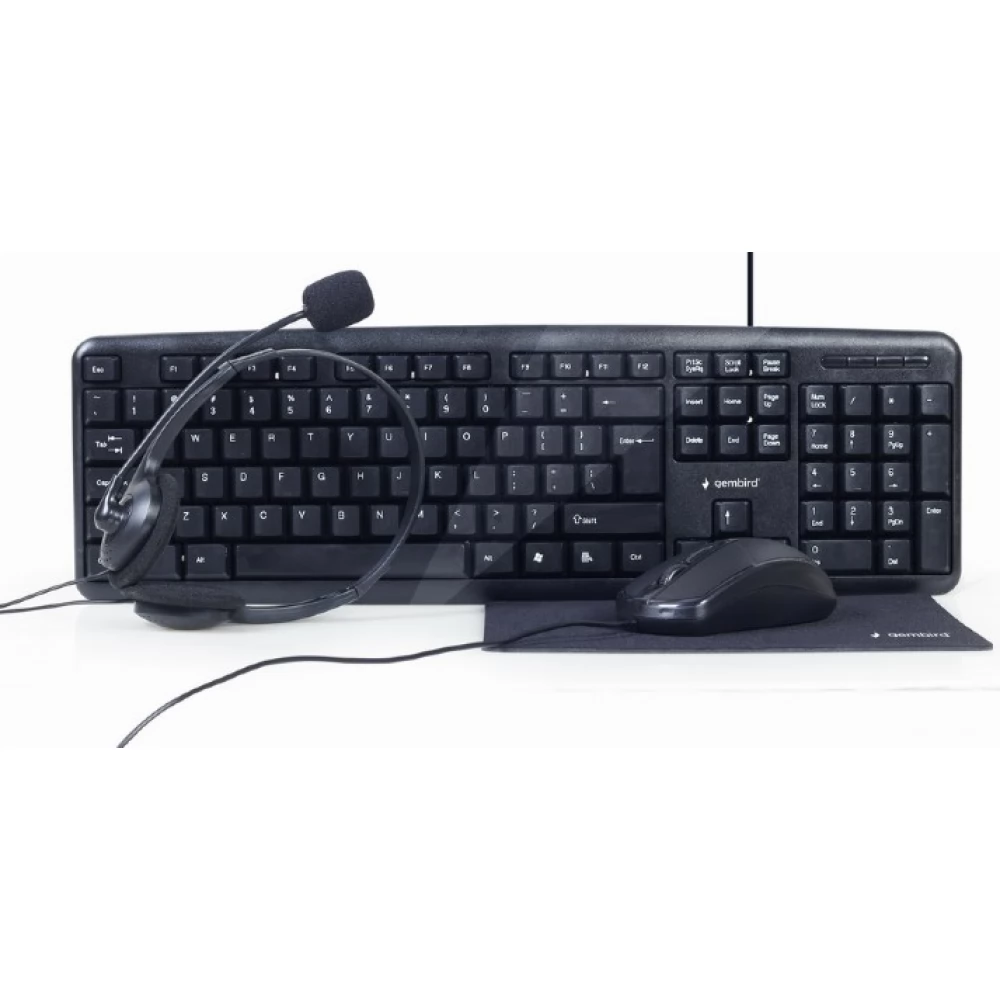 Office set with keyboard, mouse, mouse pad and audio headset.