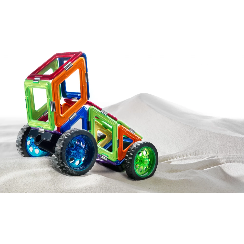 The set contains: 30 pieces of magnetic geometric shapes (4 wheels included).