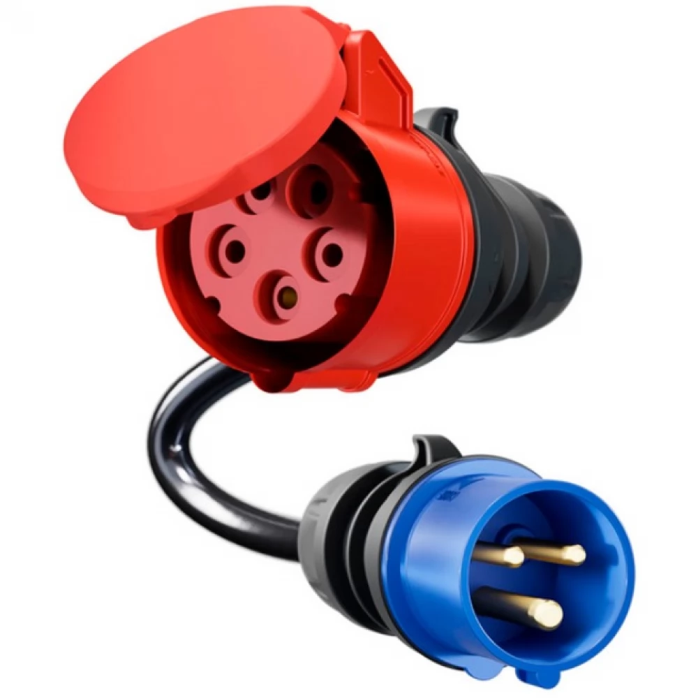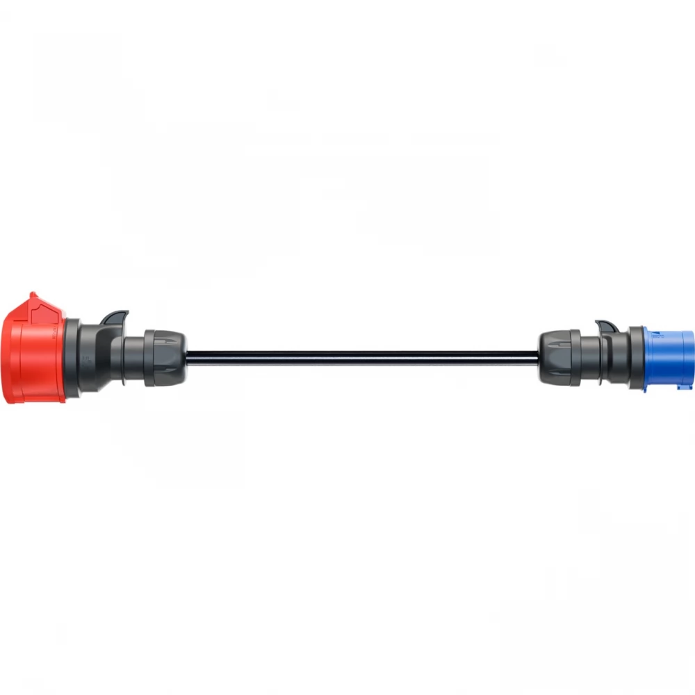 The go-e 30 cm long CH-04-31 adapter cable provides reliable charging on the go-e Charger Gemini flex 11 kW (16A CEE red three-phase connector) single-phase 16A CEE blue sockets (so-called camping plug). The adapter is also compatible with the go-e Charger HOME+ 11 kW charger.