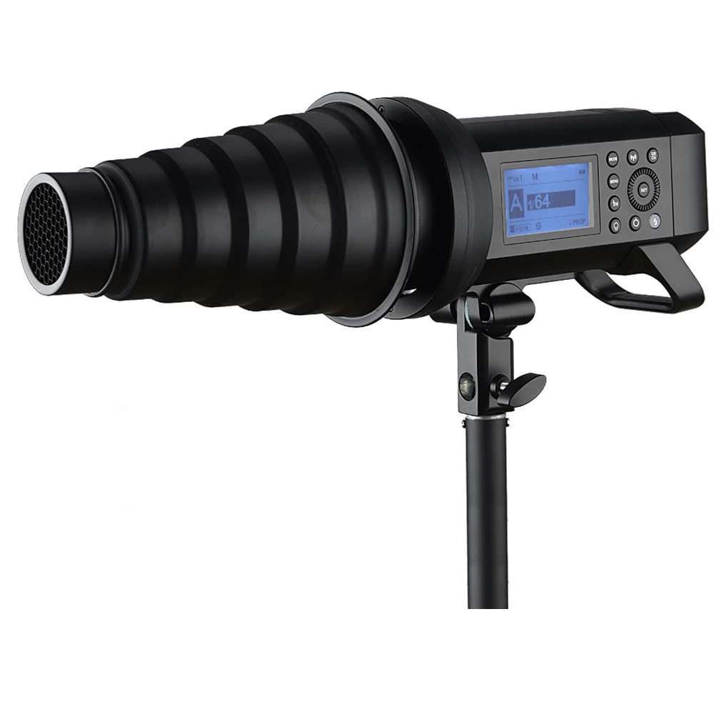 The flash head is equipped with a unique Godox connector, but the package contains a Bowens-compatible adapter that can be used with any Bowens-connected light deflector for the flash. Optionally, an adapter compatible with Broncolor or Profoto reflectors can be purchased separately.