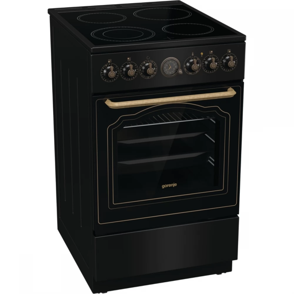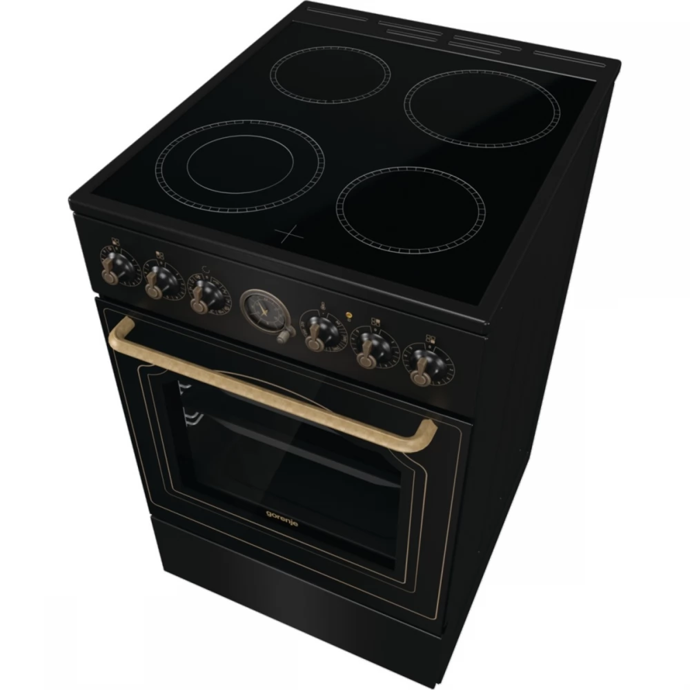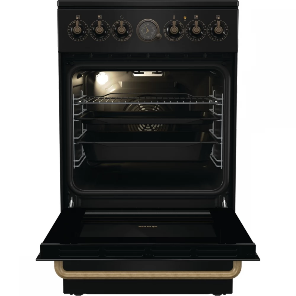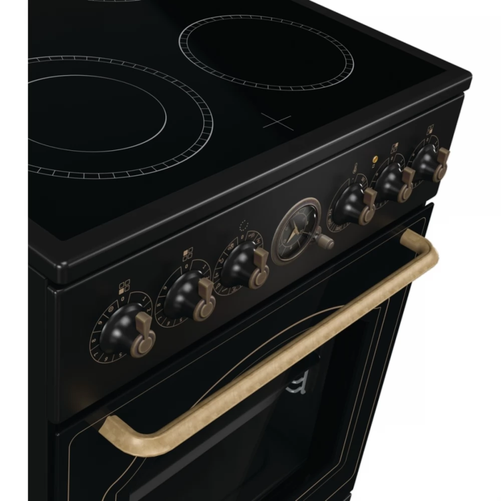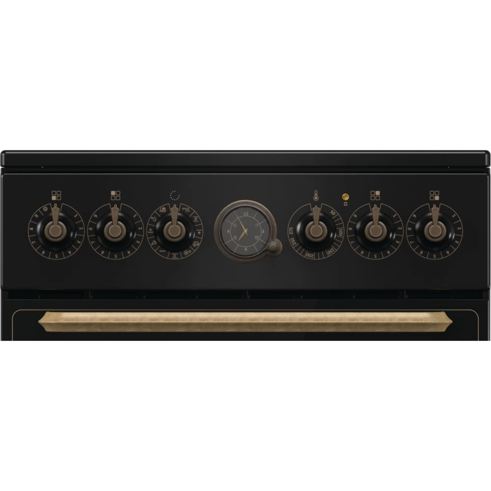 The classic analog pattern of the electronic, programmable timer is one of the highlights of the decoration of the collection. It includes a clock and a timer that allows you to set delayed start and end times for cooking. The clock signals the end of the cooking process with a sound. The classic timer and the handle with an antique gold finish complement the look of the oven.