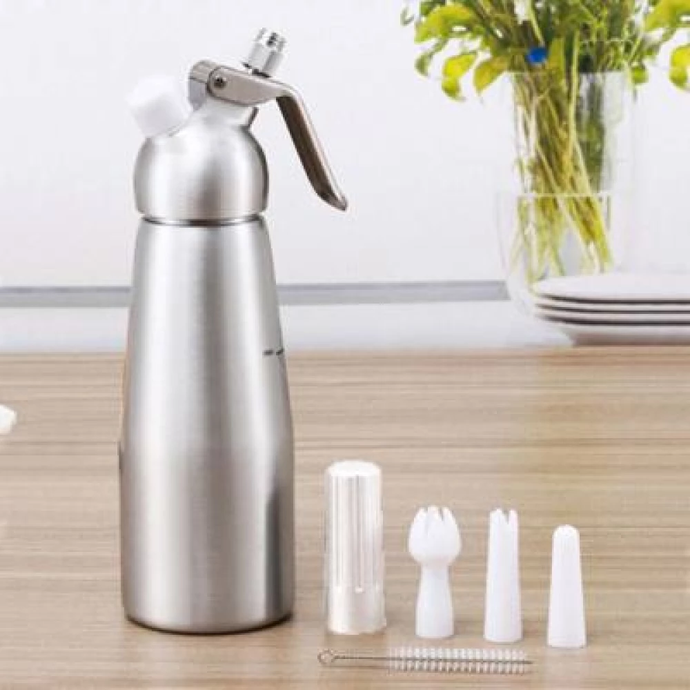 Easy-to-use 500 ml whipped cream bottle. You can use the foam siphon not only to make whipped cream, but also to make other cold desserts, ice cream or sweet and salty foams. It is a perfect addition to the kitchen, which makes work easier. Unlike disposable whipped cream bottles, you can always make fresh whipped cream, thus protecting the environment. With the help of the heads included in the package, you can also use it to decorate cakes and cookies.