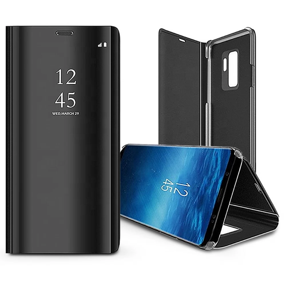 - The front of the cover is a semi-transparent mirror sheet that allows, for example, to check the time without having to open the entire case, while the back of the cover is made of durable PVC, which is also covered with high-quality eco-leather.