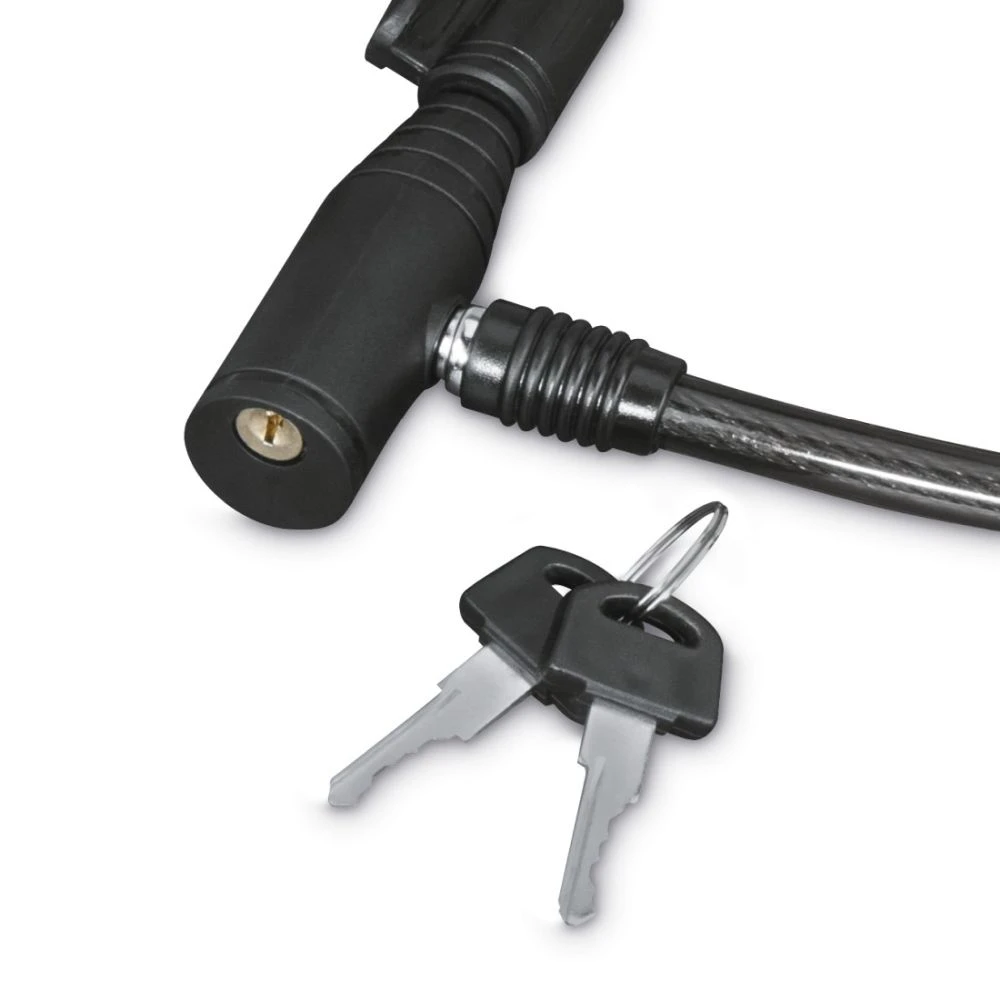 The plastic-coated steel cable lock offers a practical and versatile solution for securing bicycles or other universal uses. The protective cover helps prevent damage to the frame's paintwork, while the strong steel cable provides reliable base safety. The lock cylinder comes with two keys for convenient use, and the included transport holder allows the lock to be easily attached to the seat tube. The cable with a diameter of 10 mm ensures good handling and a stable attachment during everyday use.