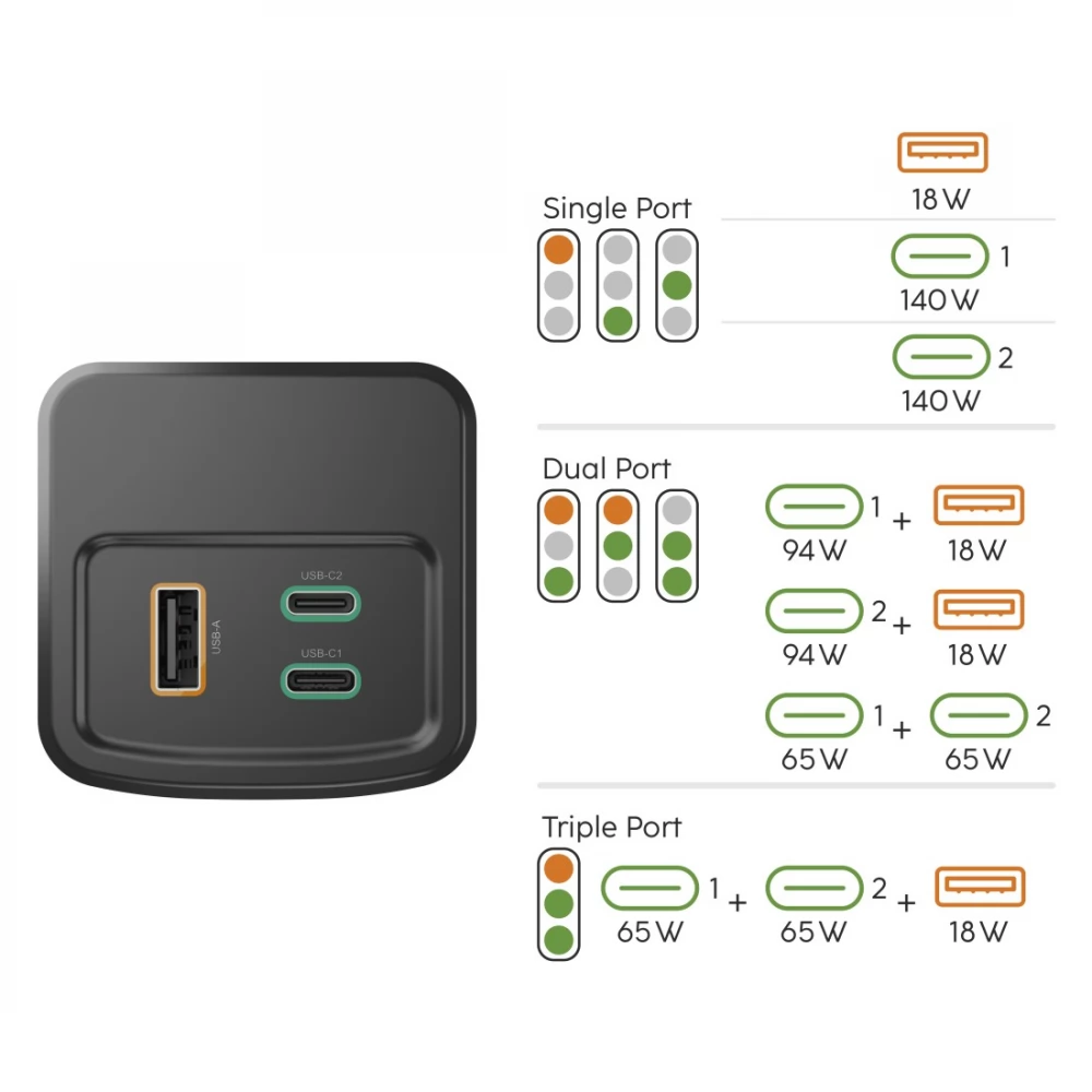 - The charger can charge three devices simultaneously via two USB-C sockets and one USB-A socket