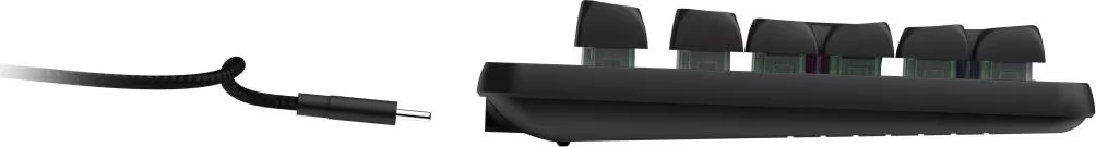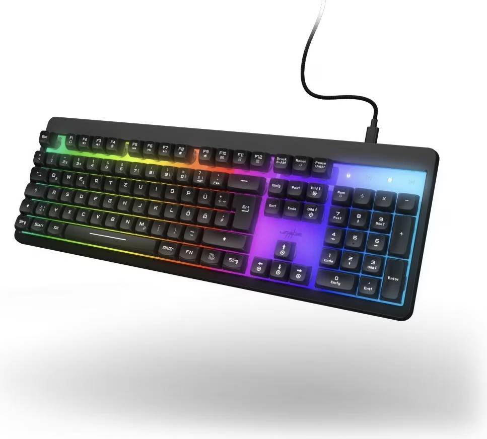 Responsive gaming keyboard. Complete flexibility and organization thanks to the detachable cable with cable tie. Direct access to 12 multimedia functions (FN functions) - simple, without disturbing the gameplay, e.g. checking emails or opening a web browser. Precise and quick reaction is guaranteed in all situations thanks to the ghost image protection with up to 26 button reversals and the WIN-Lock function. The flexible fabric covering of the cable provides greater stability and durability. Transparent surface. RGB rainbow key lighting can be turned on/off. Built-in memory for lighting settings. Adjustable height.