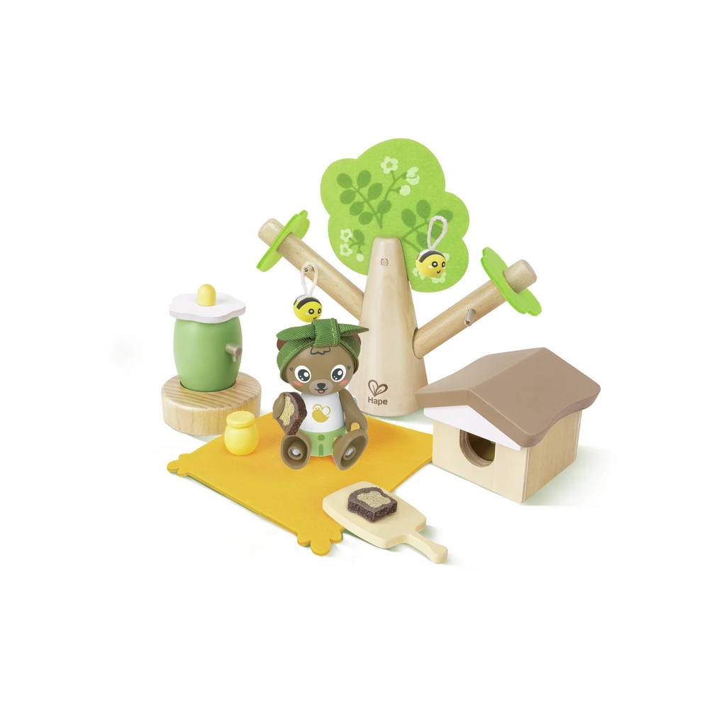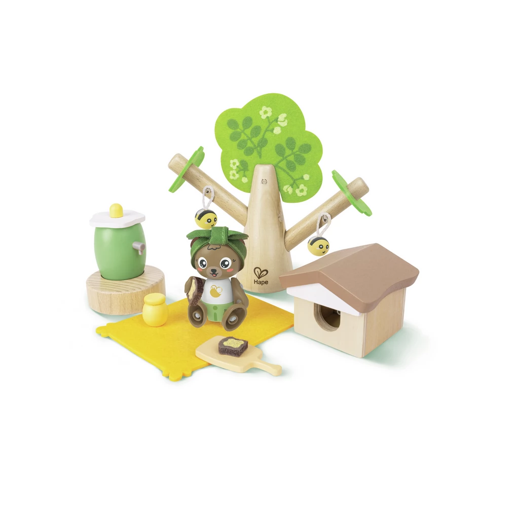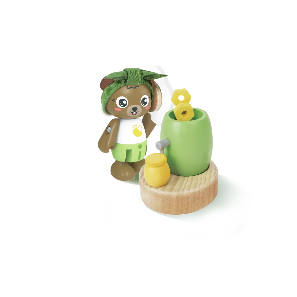 The world of bees is a wooden toy with a teddy bear and 2 bees. In the set, children can pretend to produce honey with the help of bees.