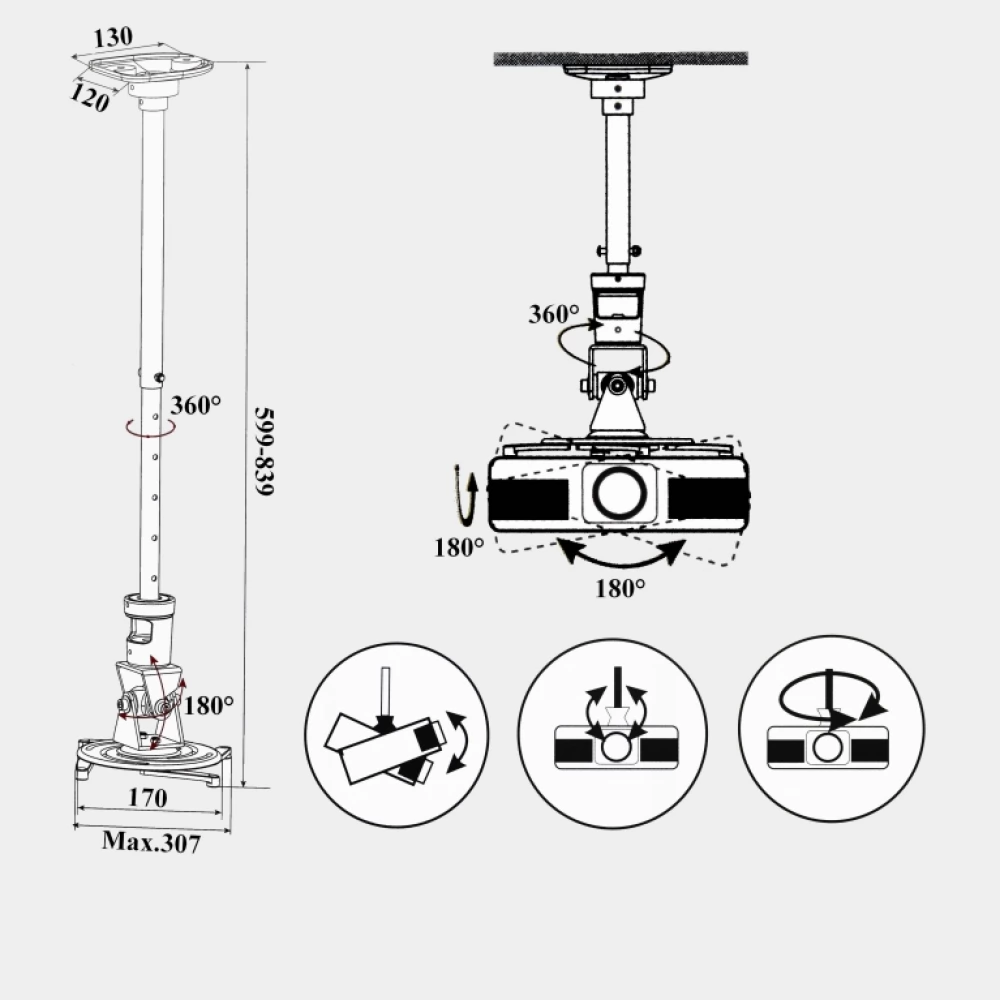 - Distance of the projector from the ceiling: 599-839mm