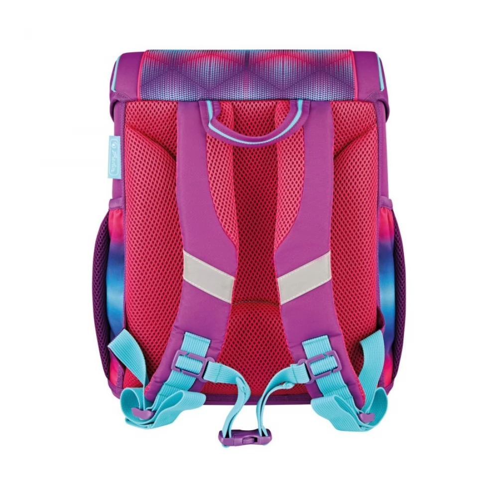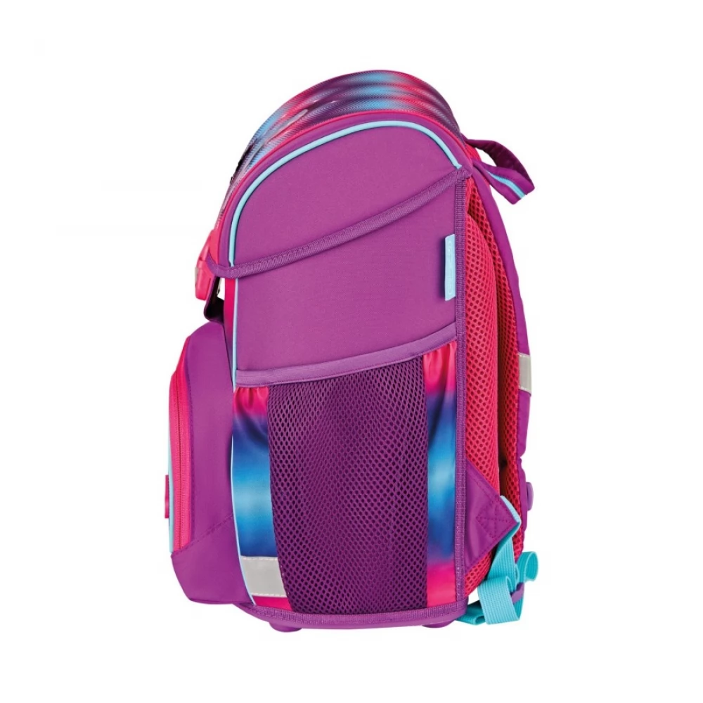 Loop ergonomic school bag, padded, size: 37x31x22 cm, weight: 950g, capacity: 16 liters, material: polyester, with an impregnated layer against rain and moisture. Special features: well-ventilated back design, easily adjustable shoulder straps, adjustable chest strap, reinforced bottom panel, practical handle, click lock, Oralite reflective overlays. Equipment: 16-part pen holder, cylinder pen holder, sports bag.