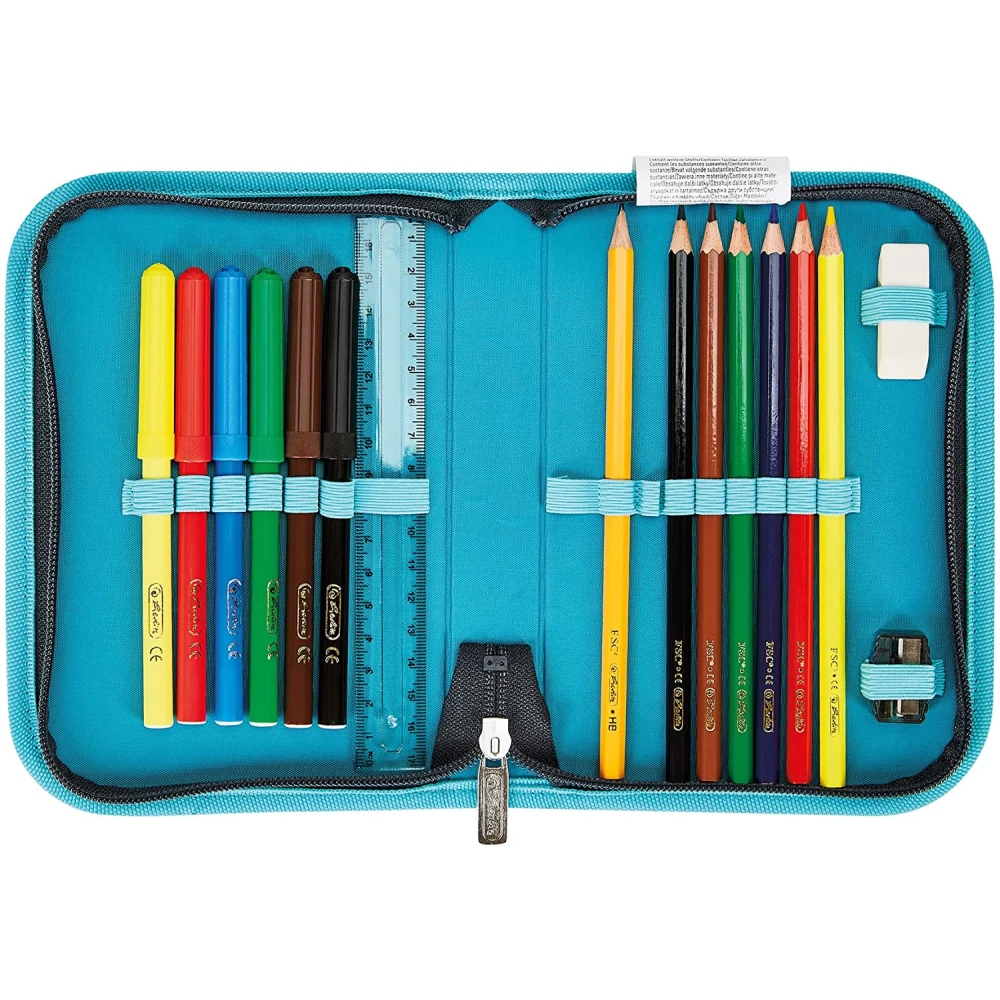 Simple school pen holder, which contains 6 felt pens, 1 ruler, 1 pencil, 6 colored pencils, 1 eraser, 1 sharpener. Size: 19.5 x 13.7 x 3 cm.