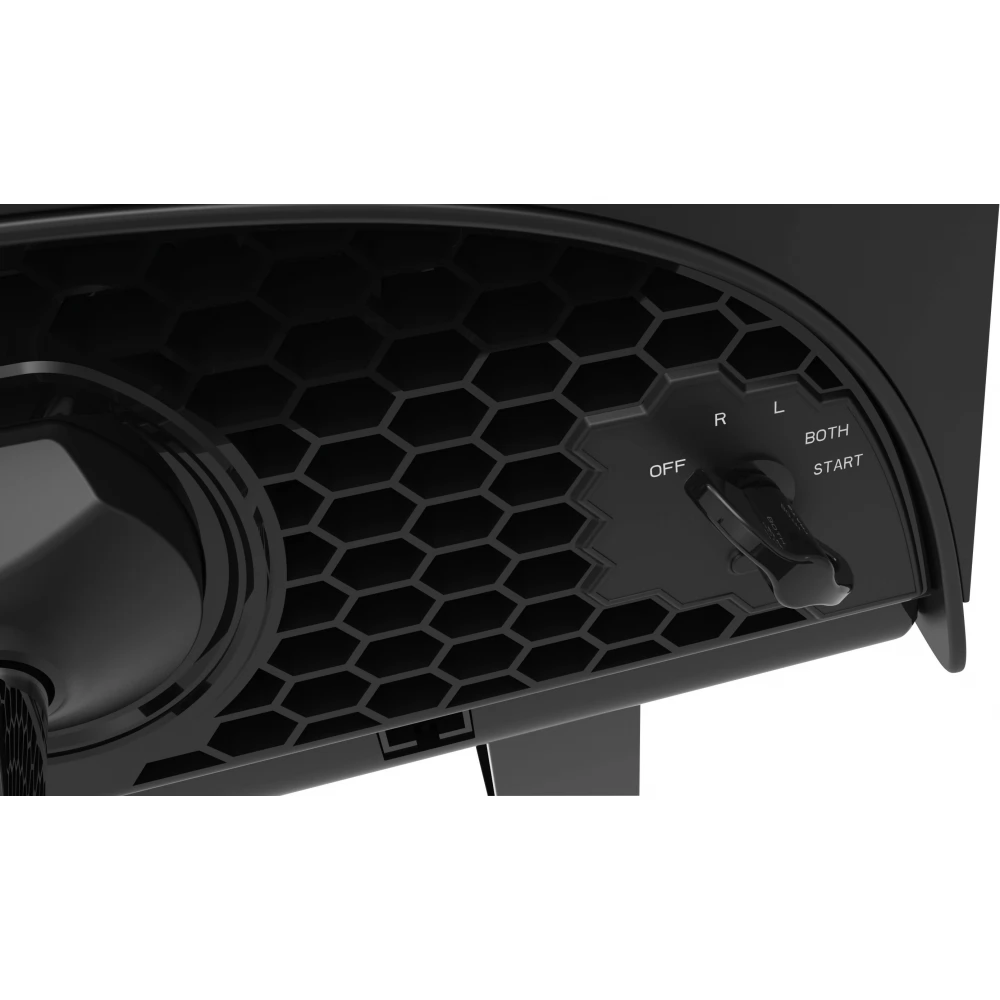- The right handle contains two horizontal 2-way rocker switches, a large and a small button.