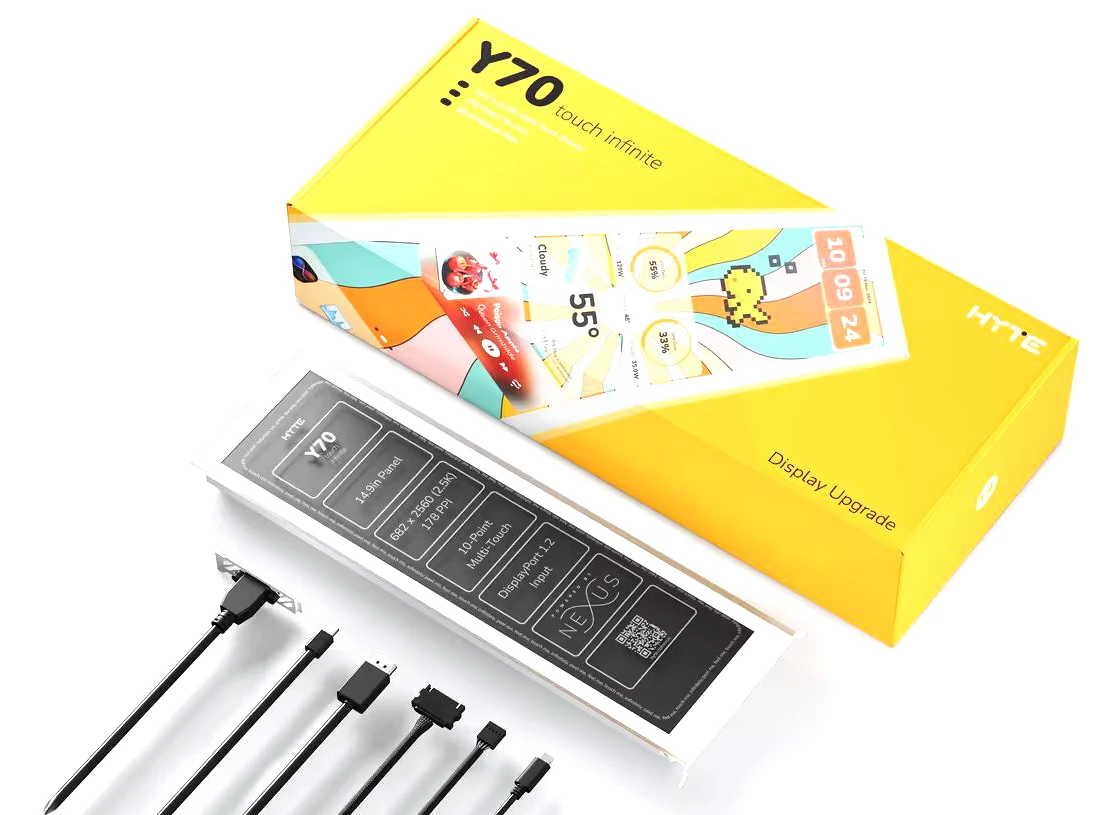 Elevate your Y70 display with this 14.9-inch IPS panel, featuring a 682 x 2560 (2.5K) resolution, 60Hz refresh rate, 10-point multi-touch capability, and a wide range of customizable screens powered by HYTE Nexus. has The package contains all the elements with which you can easily install this fantastic display yourself.