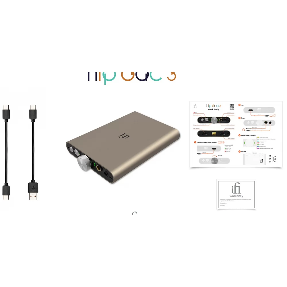 The hip-dac 3's 2200mAh battery provides up to 12 hours of battery life, which varies according to the volume and the headphones' energy demand. Includes a USB-C OTG cable and a USB-A to USB-C cable.
