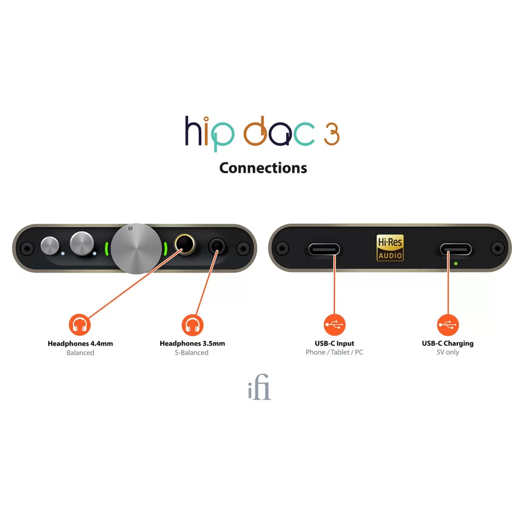 The hip-dac 3 provides two outputs: a 3.5mm jack for single-ended headphones and a 4.4mm balanced output for those with a balanced jack, taking advantage of the device's differential amplifier design. The 3.5mm output uses iFi S-Balanced circuitry, minimizing crosstalk and distortion for single-ended connections.