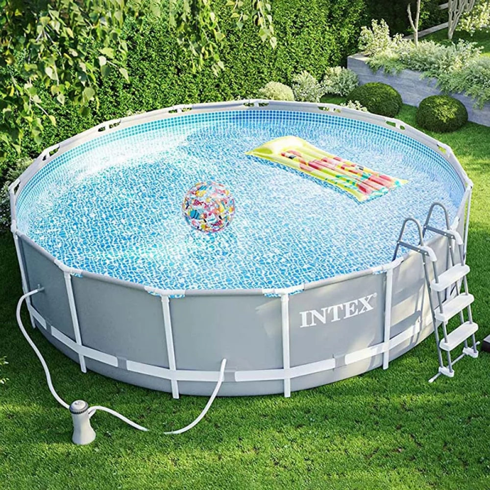 The Intex Prism Frame rigid pelvis is 4.57 meters and 1.07 meters height. Thanks to the metal frame, it has extremely massive and has a long life. The bottom and wall of the pelvis are made of 3 layers of Super-Tough material, which contributes to its durability. The set includes a paper filter water rotation system, a safety ladder, a protective blanket and a washer foil, as well as 2 pipes and 4 plastic clamps. Assembling is fast and easy, storing easy. The ladder is a coated steel ladder, which can be easily assembled quickly. The pool can be set up easily and quickly in up to 45 minutes.