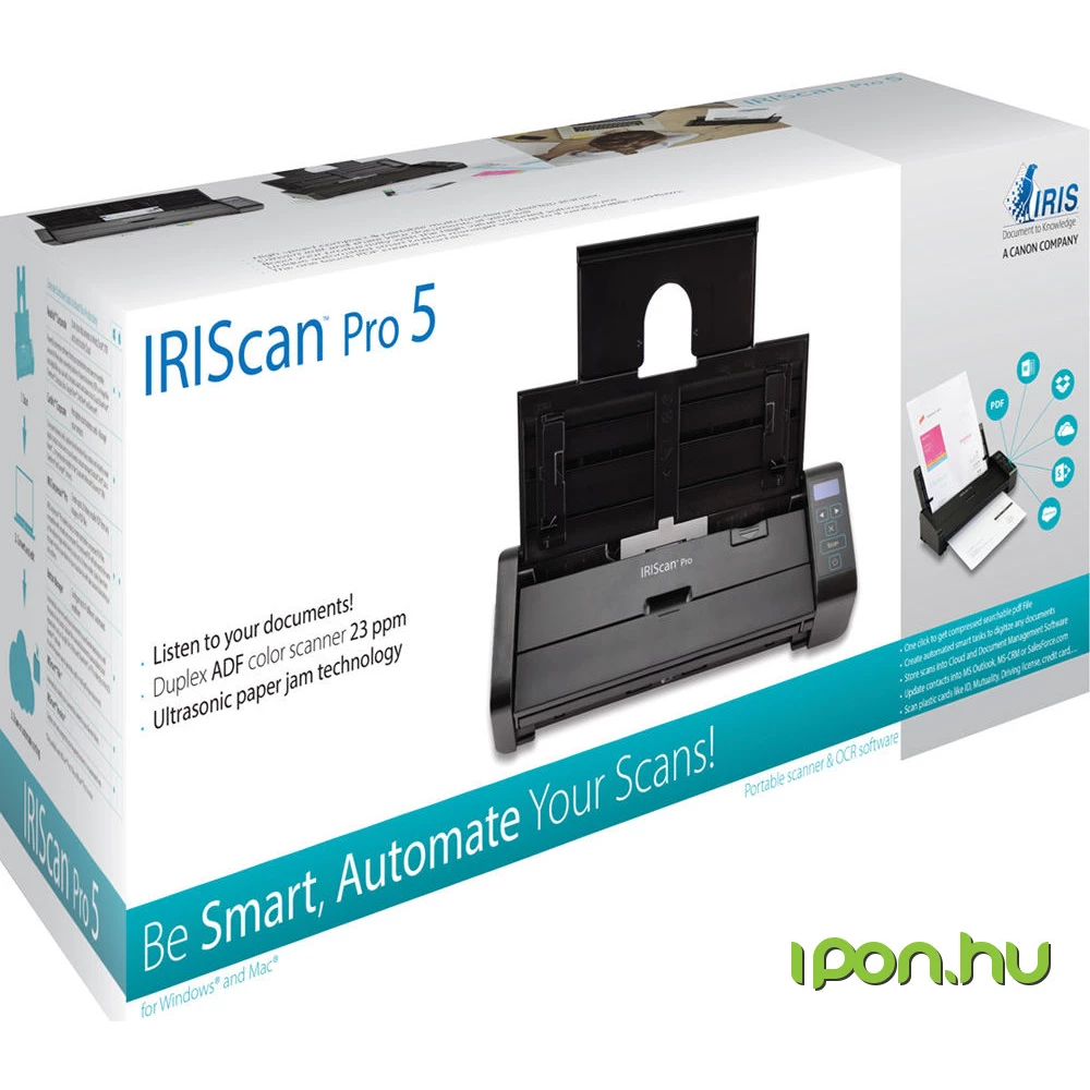 - Scan 23 pages in one minute! - Scan documents at the highest possible speed with this powerful two-sided desktop scanner. IRIScan™ Pro 5 with a speed of 23 pages per minute (46 images per minute in duplex mode). In the blink of an eye, invoices, receipts and other documents are scanned into PDF or MS Office (Word, Excel, etc.) format and saved directly to the cloud or DMS.