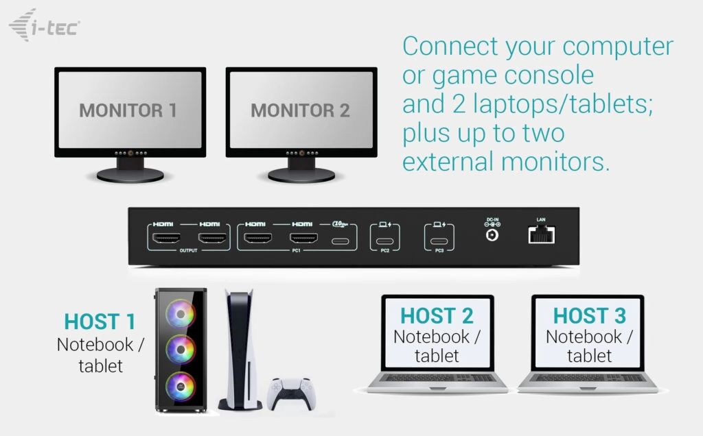 This high -end docking station is designed for professional and multimedia and also supports the simultaneous connection of three hosts - one PC or game console and two notebooks or tablets.
