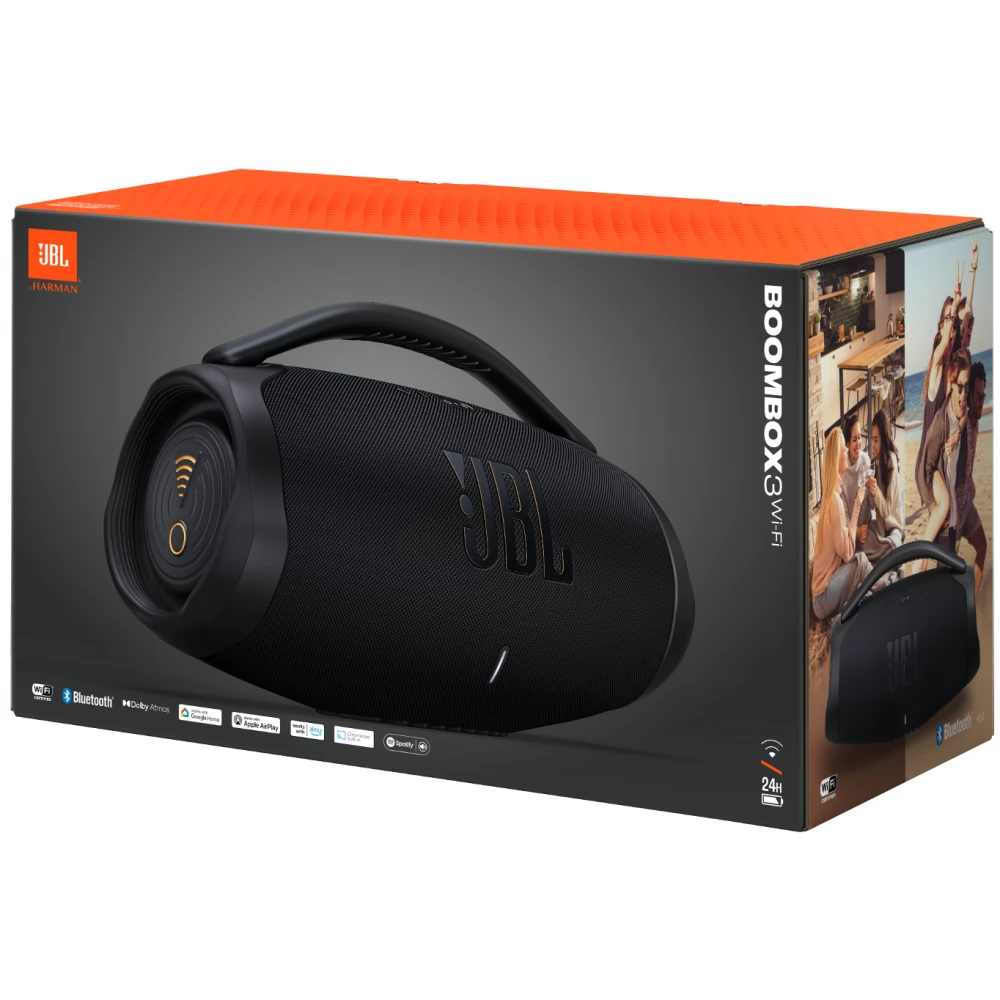 The JBL Boombox 3 Wi-Fi and Bluetooth speaker provides massive JBL Original Pro sound with the deepest bass. Stream high-definition music anywhere with the JBL Boombox 3, even in 3D Dolby Atmos via Wi-Fi. Are you taking a call or scrolling through the news feed? Take it easy - don't interrupt the music. Simply switch to Bluetooth and enjoy a seamless audio experience, indoors or outdoors. With a battery that provides 24 hours of playing time, as well as a water- and dust-resistant design, you're always ready for all-day fun. Stream music with AirPlay, Alexa Multi-Room Music, Chromecast built-in™ and Spotify Connect. Enjoy your favorite audio content, internet radio and podcasts in high definition.