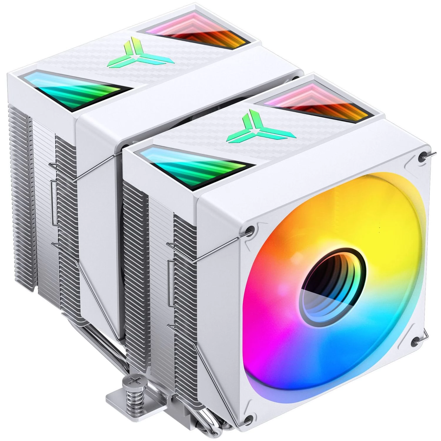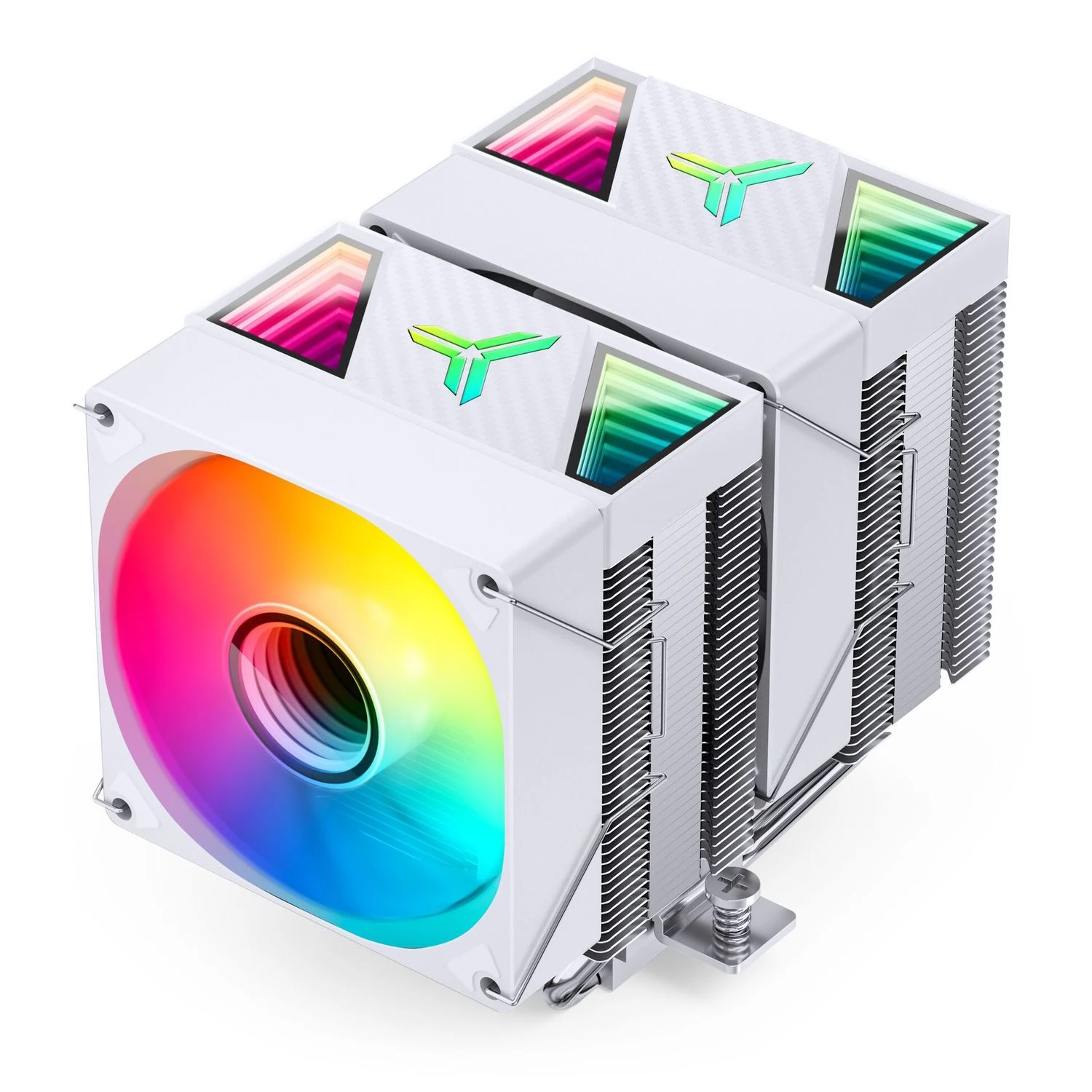 Double tower-designed heat conductive tubular, universal CPU refrigerator with 2 92mm controlled ARGB lighting and PWM-speed fans. The specialty of the refrigerator is the direct contact with the heat conductive pipes and the infinite mirror light, which can be seen on the fans and the heat sink lids.