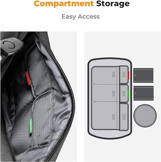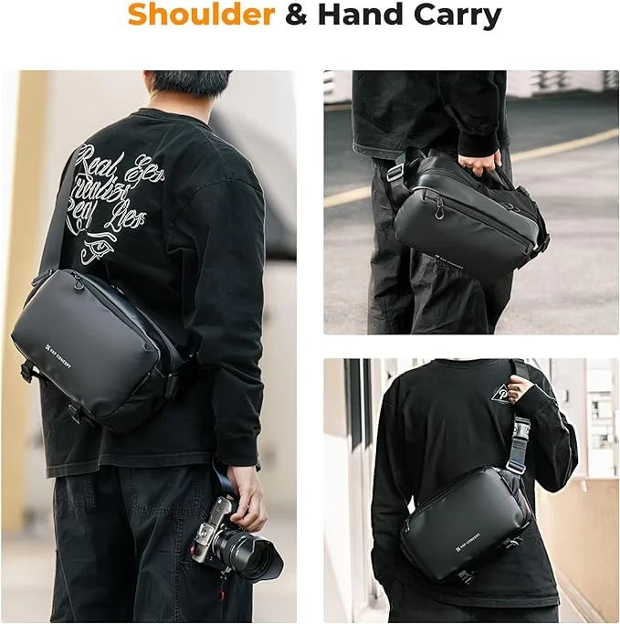The black and gray version of the K&F Concept Alpha Camera Sling Bag has a capacity of 10 liters, in which you can easily store your camera and up to two lenses. The interior is flexible and easily rearranged, the storage compartments are ideal for storing tools and accessories. The zipper pull rings are lockable, providing extra security for your devices. Multi-functional use: You can carry the bag on your shoulder, waist or even as a side bag. It is made of waterproof, scratch and wear-resistant material, so your equipment will be protected from shocks and moisture. The bag is made of 10mm thick, high density EPE impact resistant cotton for extra protection.