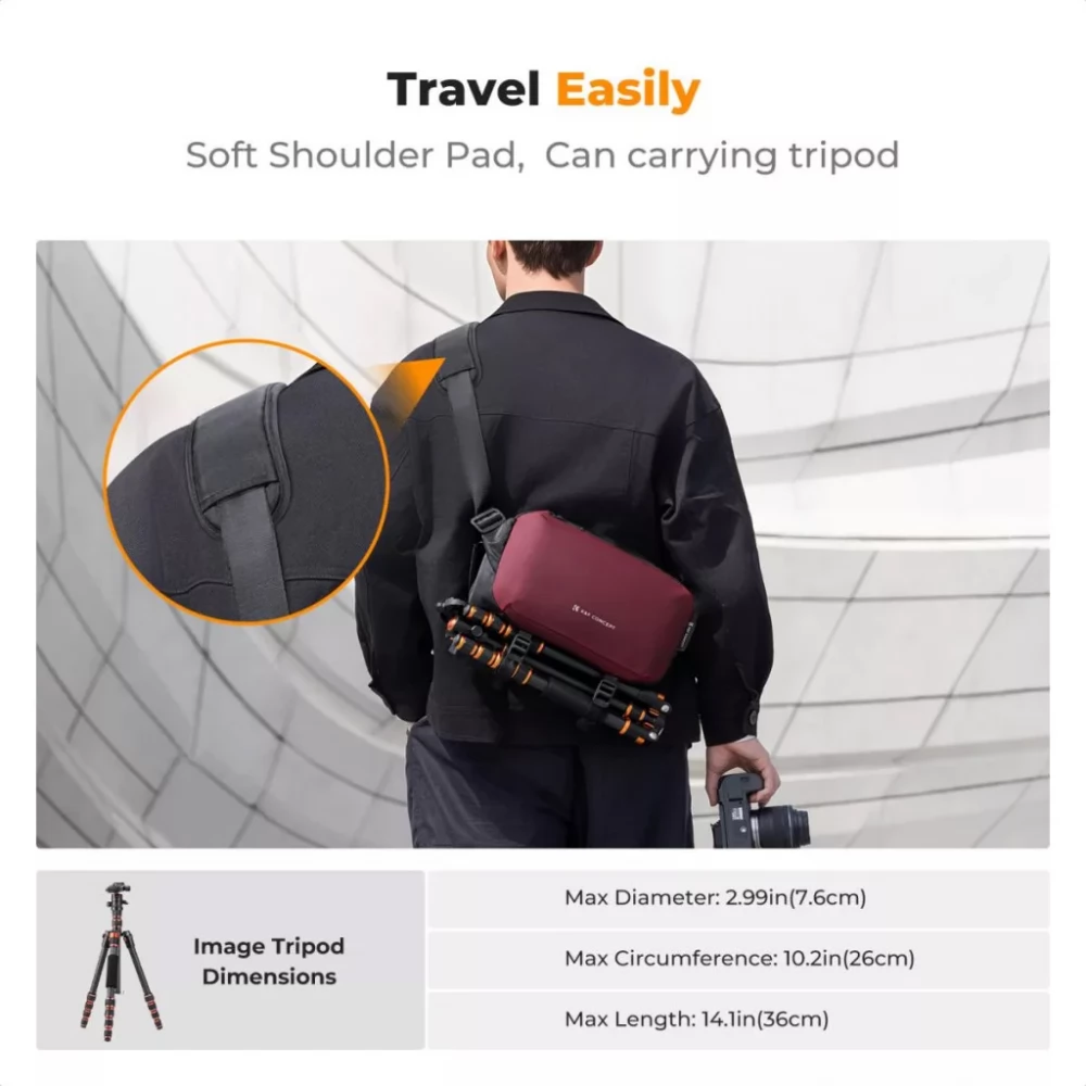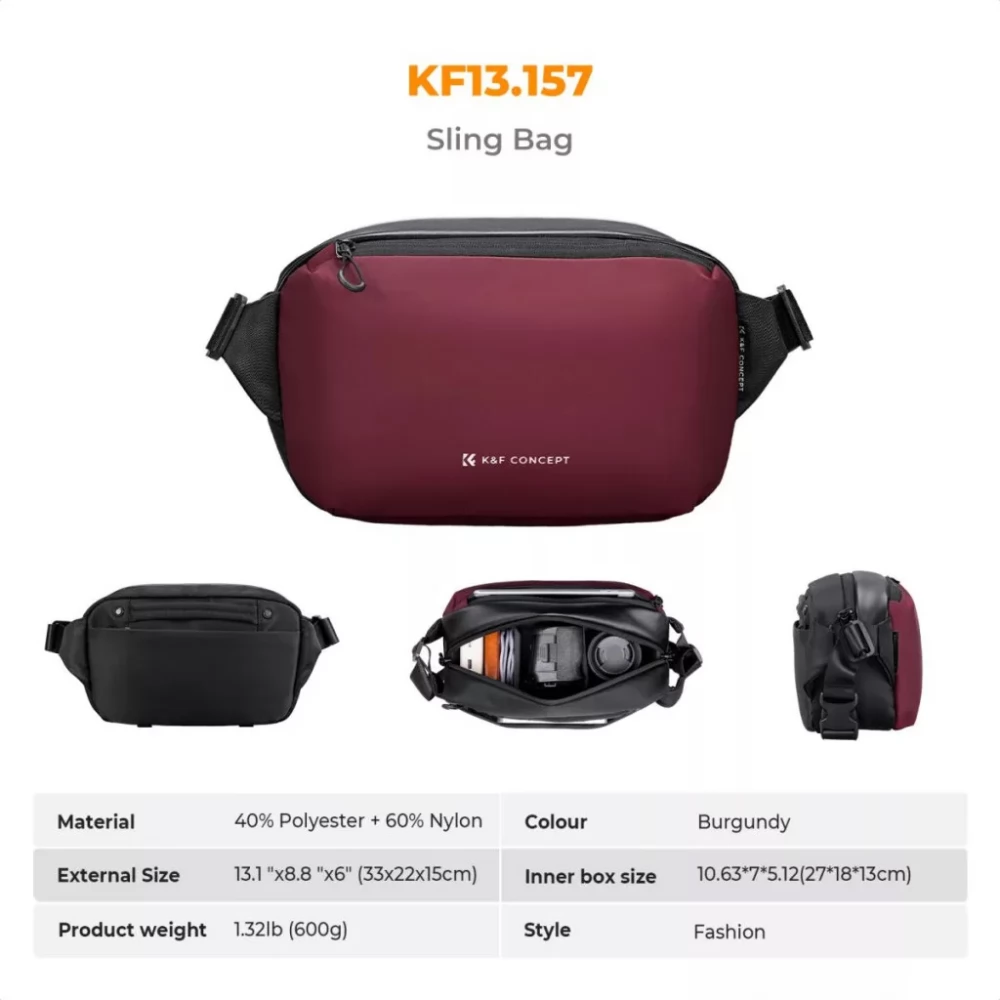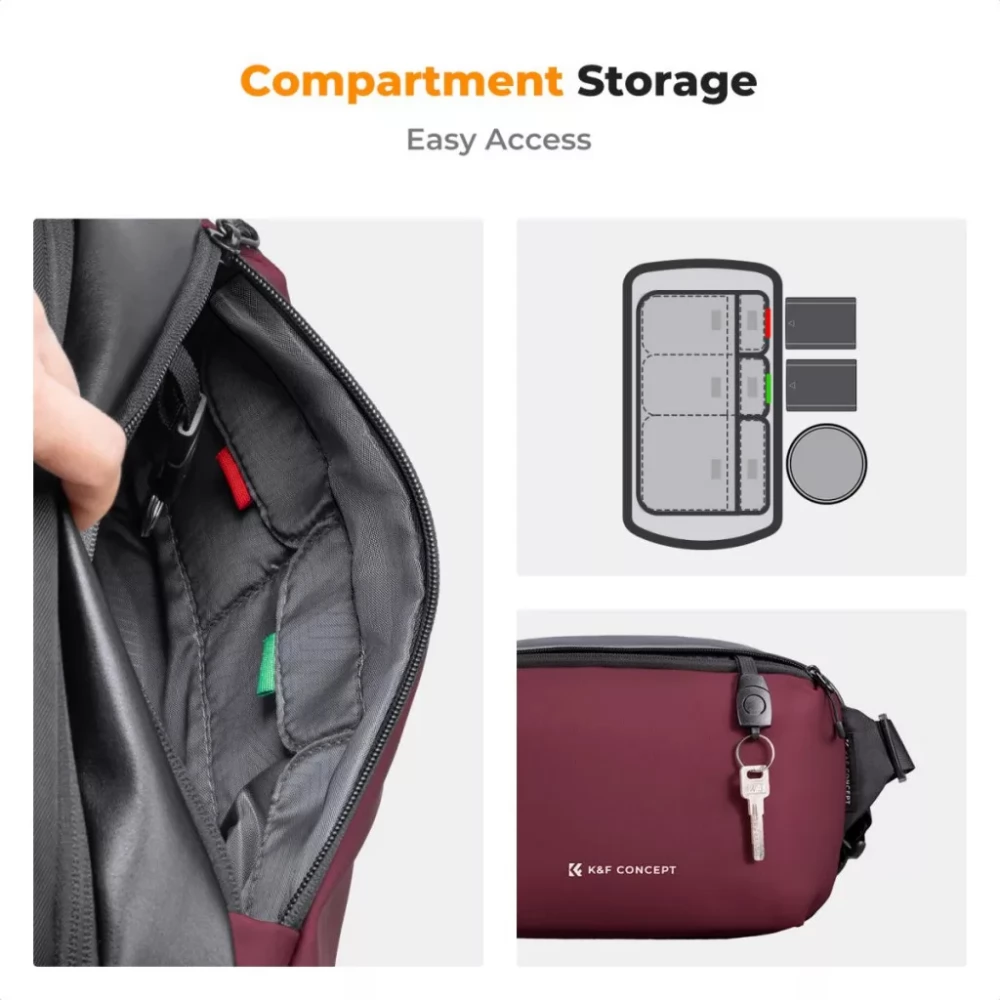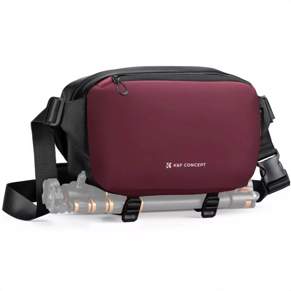 The burgundy version of the K&F Concept Alpha Camera Sling Bag has a capacity of 10 liters, in which you can easily store your camera and up to two lenses. The interior is flexible and easily rearranged, the storage compartments are ideal for storing tools and accessories. The zipper pull rings are lockable, providing extra security for your devices. Multi-functional use: You can carry the bag on your shoulder, waist or even as a side bag. It is made of waterproof, scratch and wear-resistant material, so your equipment will be protected from shocks and moisture. The bag is made of 10mm thick high density EPE impact resistant cotton for extra protection.