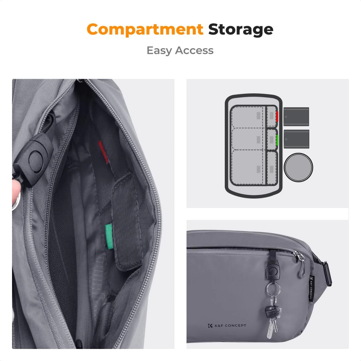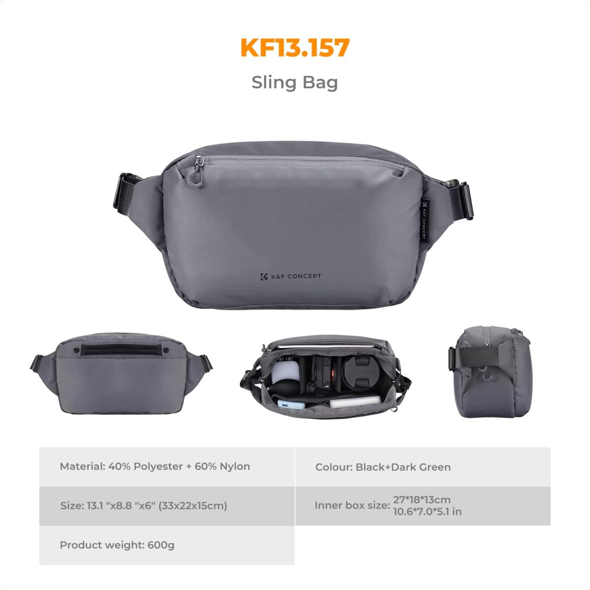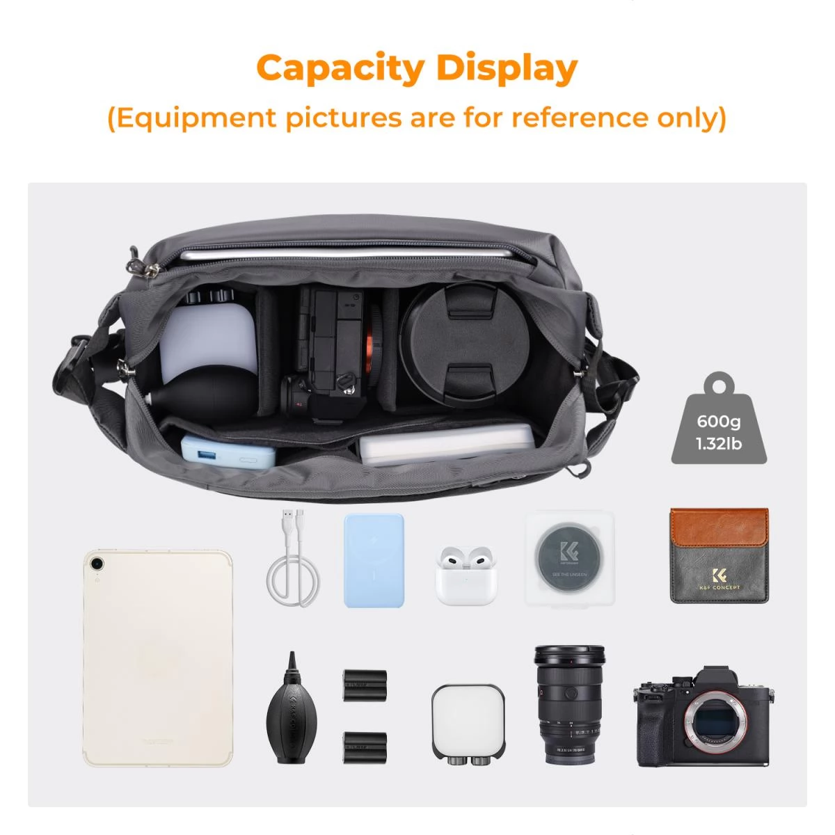 The gray version of the K&F Camept Alpha Camera Sling Bag has a 10 -liter capacity, where you can easily store your camera and up to two lenses. The inner part can be well shaped and easily rearranged, and the storage compartments are ideal for storing devices and accessories. The zipper's pull rings can be locked, so extra security for your devices. Multi -functional use: You can wear the bag on your shoulders, waist or even as a side bag. Made of waterproof, scratching abrasion resistant, so your equipment will be protected from punches and moisture. The bag is made of 10 mm thick, high -density bile from impact -resistant cotton for extra protection.