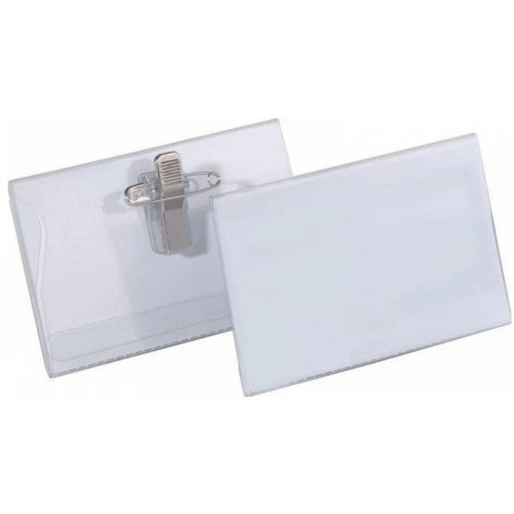 Business card holder with clip for storing 9.6 x 7.5 cm cards made of PVC. Can be attached to clothes with a pin or clip. Pack of 50 pieces.