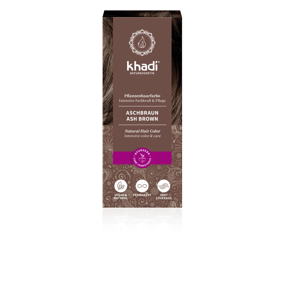 "Khadi ash brown hair dye colors your hair in a matte brown shade - without reddish reflections. The precious, purely vegetable ingredients give the hair intense color reflexes and provide rich care - color, volume and shine in one step! Indigo and henna are vibrant, they provide long-lasting color and cover white and gray hair very well.Vegetable pigments surround each hair like a nourishing glaze.Cassia nourishes and ensures a strong hair structure.Amla, Bhringaraj and Neem add shine and volume to your hair.