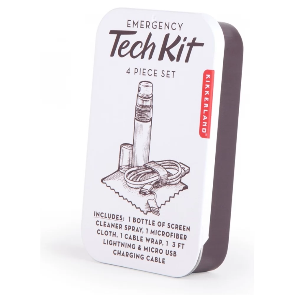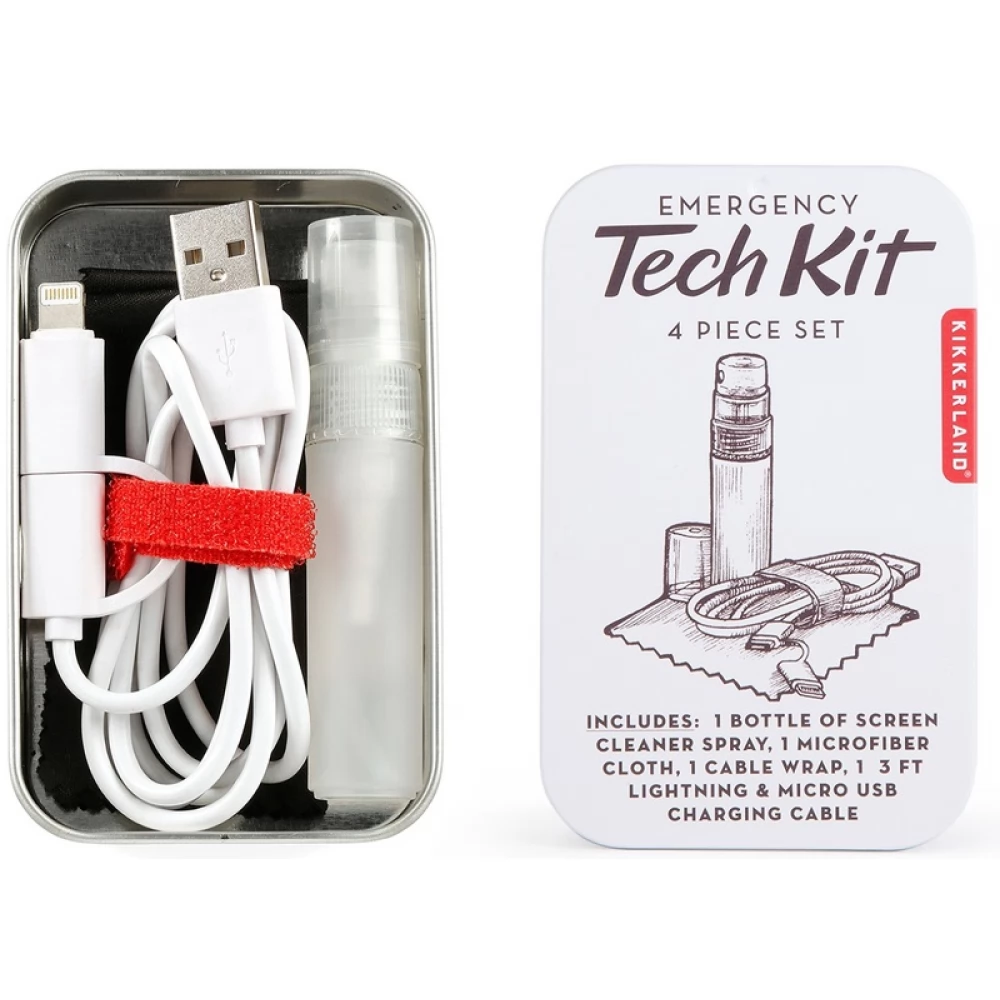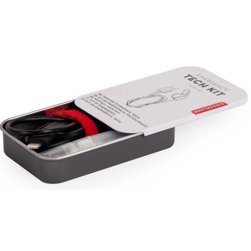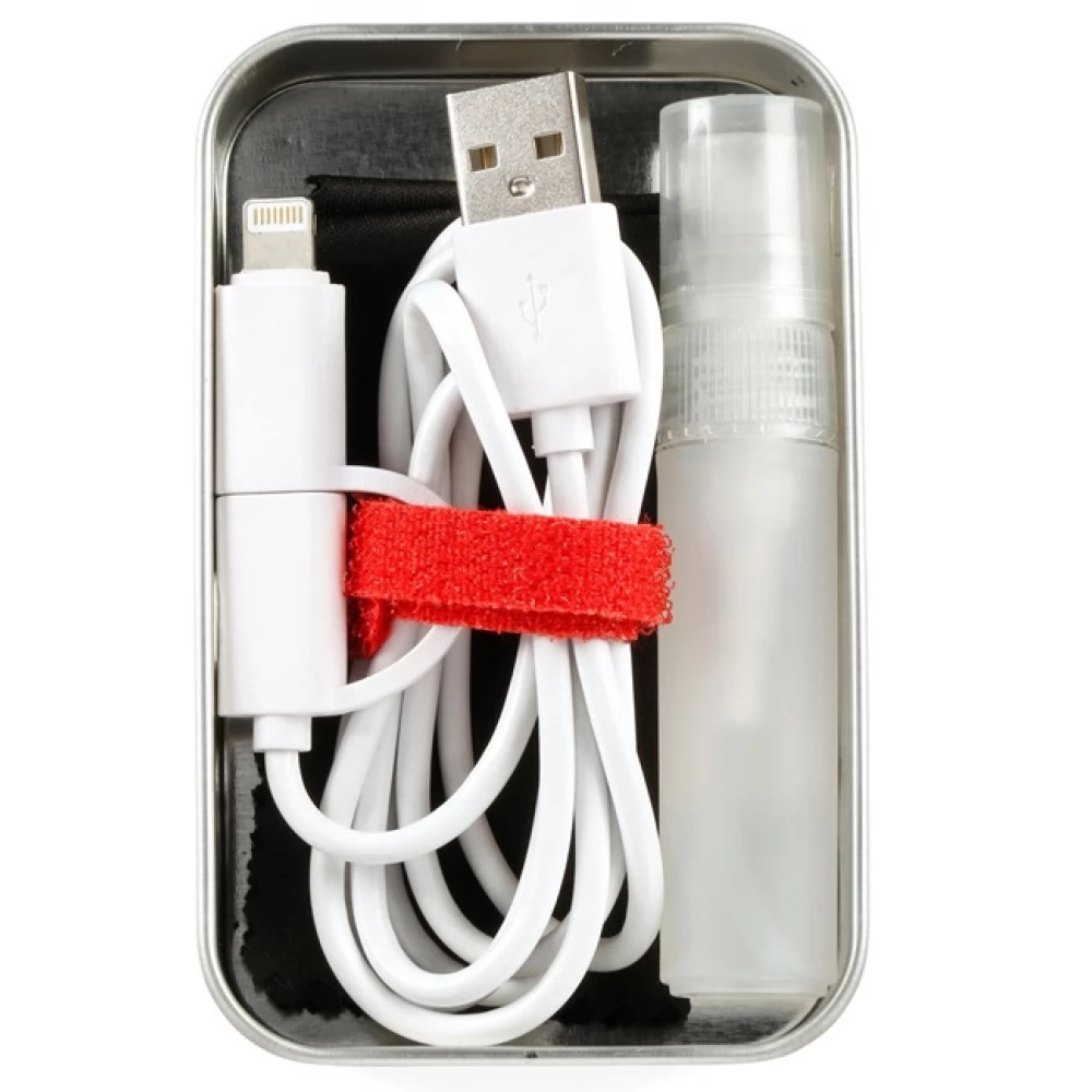 Emergency kit for gadgets. Charge, clean and organize your electronic gadgets on the go. Contents: microfiber cloth, USB cable, red cable organizer, cleaning liquid.
