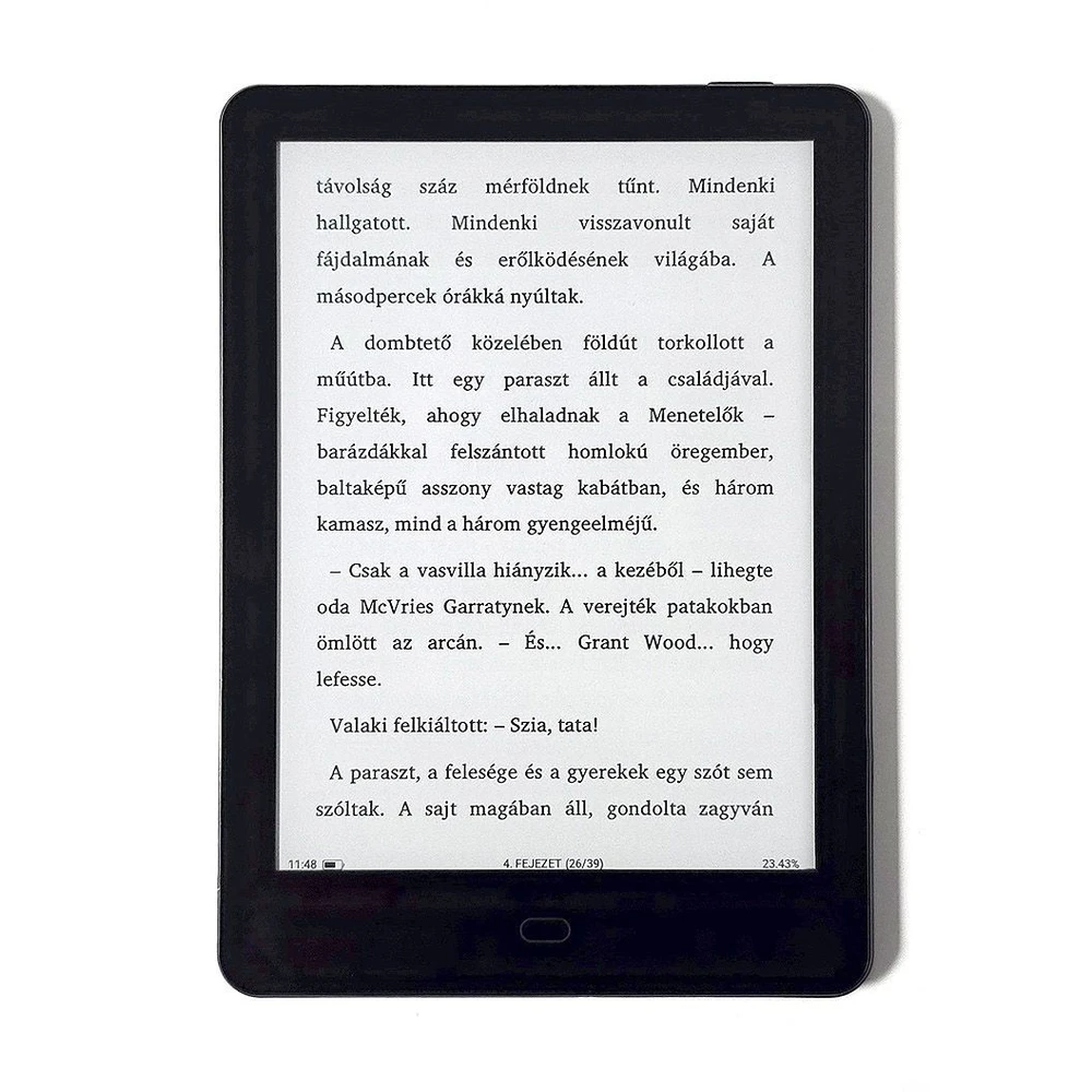 The device comes with a multilingual menu system, with Hungarian as the default setting, and supports all important e-book formats (TXT, PDF, EPUB, FB2, DOC, AZW, AZW3, MOBI, etc.) and image formats (PNG, JPG, JPEG, TIFF).